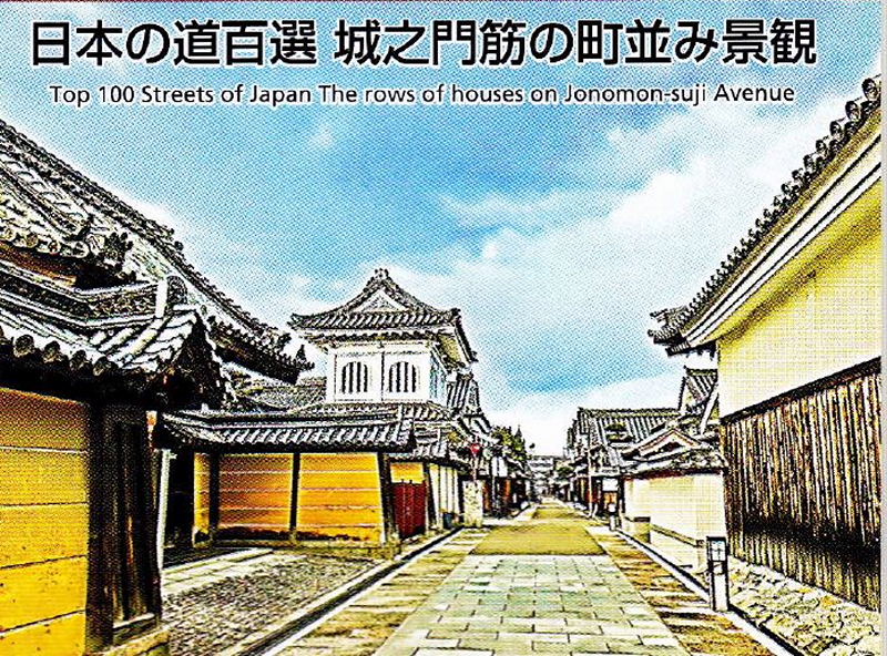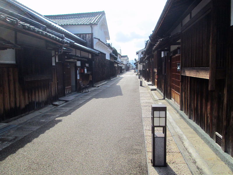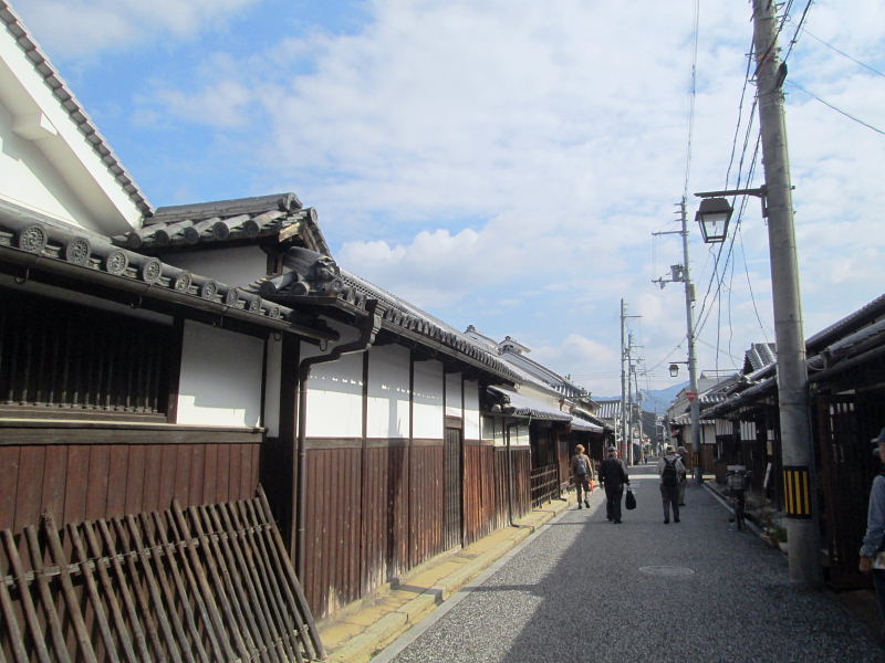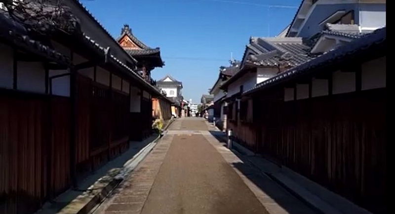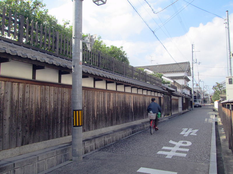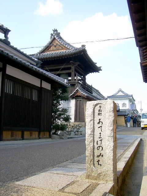 | 城之門筋 (あてまげの道) 寺内町は戦国時代の自治・自衛都市の町割をそのまま残しており、 直交する2つの道路(南北が筋、東西が町)をわずかにずらすことで、 遠方がまっすぐに見通せない構造になっている。 |