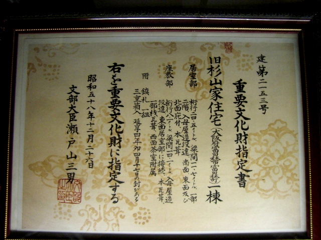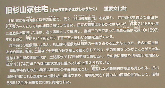 | 富田林寺内町の国の指定重要文化財・旧杉山家 4層の大屋根が特徴。寺内町の創設期からの旧家で、代々造り酒屋を営み、南河内酒造業の肝煎り役を務めました。主屋は土間が17世紀中頃と古く、享保19年(1734)ごろ現在の形に整いました。 富田林寺内町造営の中心であった八人衆の筆頭年寄であった杉山家は、当初木綿問屋を営み、その後酒造業を始めた河内酒造業の肝いり役を務めた大商家。明治の明星派歌人・石上露子(いそのかみつゆこ)の生家でもあります。 寺内町最古・最大の南河内地方農家風建築様式であり、屋敷地は一区画(千坪、現在は430坪)を占め、当時の繁栄を見ることができます。 |