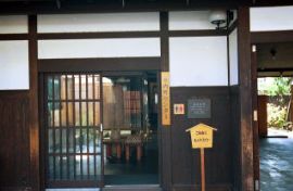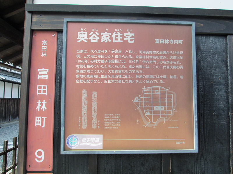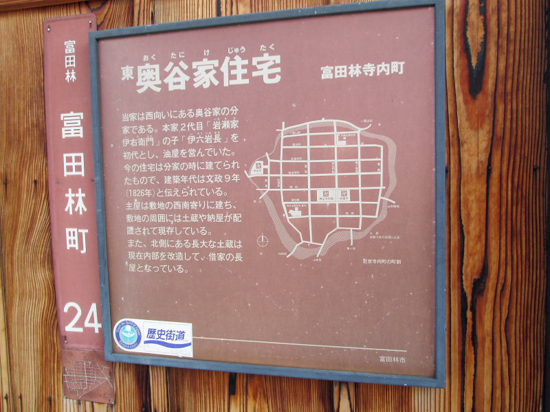 | 奥谷家 建築年代: 1826年 (文政9年) 所在: 城之門筋・富山町 (じないまち散策地図) 由来: 当家は西向かいにある奥谷家の分家である。 本家2代目岩瀬屋伊右衛門の子伊六岩長を初代として油屋を営んでいた。 建物の特徴: 屋敷地は一区画の西半分。母屋、納屋、土蔵が周囲を取り巻く。今の建物は分家の時に建てられたもので、建築年代は文政9年(1826年)と伝えられている。母屋(入母屋造)は敷地の西南寄りに建ち、敷地の周囲には土蔵や納屋が配置されて現存している。 また、北側にある長大な土蔵は現在、内部を改造して借家の長屋となっている。 |