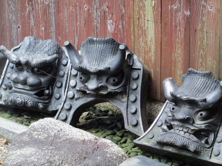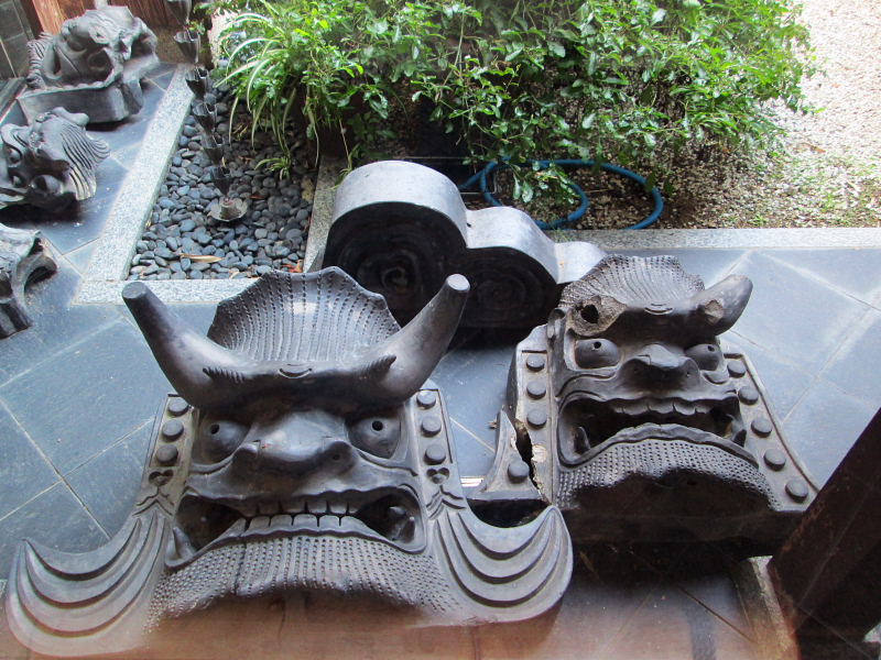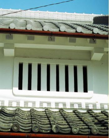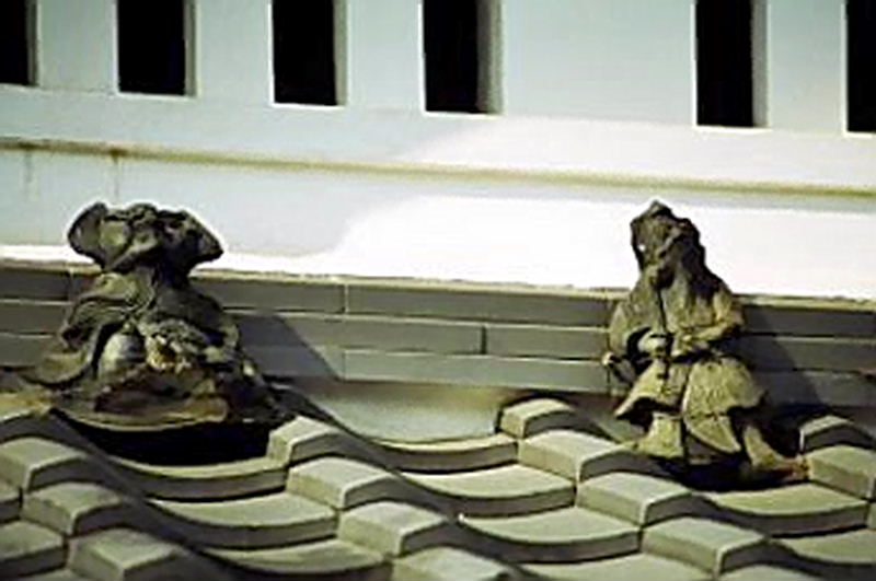 | 魔除けの瓦人形 (母屋南側妻面、堺筋) 魔除けの鐘馗(しょうき)さん 京都でもよく見かけますが、町家の屋根に載っている瓦人形の鐘馗(しょうき)さんは、通りを挟んでちょうど向かい側の家の鬼瓦に対面する位置に置かれています。富田林・寺内町にある城之門筋を挟んで、それぞれ向かい合う杉田家住宅と田守家住宅。渋谷家住宅と小田家住宅。いずれも魔除けの鐘馗(しょうき)さんが、それぞれ相手側の鬼瓦に向かって置かれています。 |