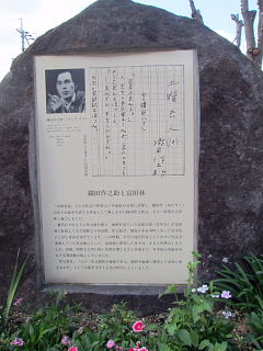 | 本町公園 (富田林駅から徒歩3分) 富田林駅から寺内町へ向かう本町筋の途中にある本町公園(本町交番南隣)には左記の歌が刻まれた石上露子記念碑が建てられています。また、富田林に逗留した作家・織田作之助記念碑(作品「土曜夫人」の原稿)が建てられています。 |