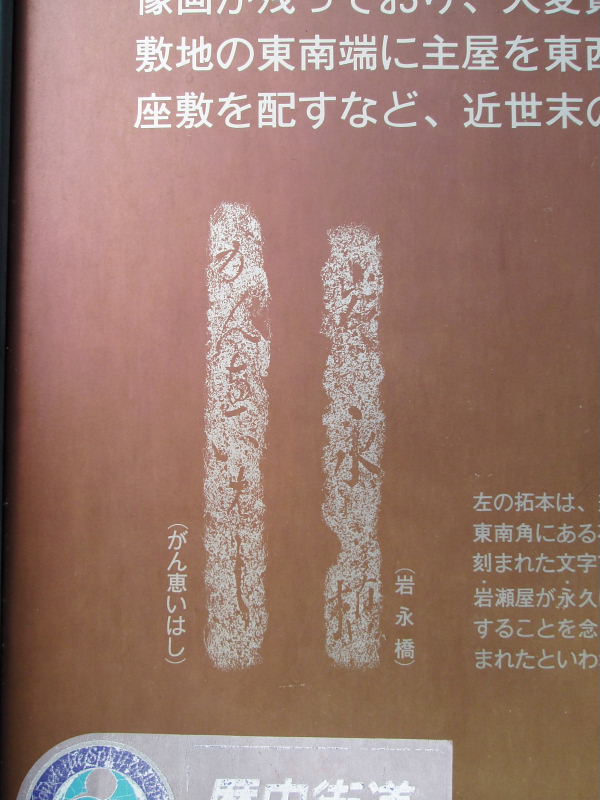 | 用心堀 (暗渠)と岩永橋 (がんえいはし) 東側の城之門筋に沿って用心堀(暗渠)が通っており、架けられた岩橋の耳石に刻まれた文字「岩永橋 (がん恵はし)」は、岩瀬屋が永久に繁栄することを念じて刻まれたと言われている 。 |