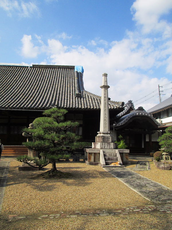 ![]() 証秀上人記念塔 本堂脇には興正寺別院(富田林御坊)の開基である興正寺第14世・証秀上人の記念塔があります。 興正寺別院を中核に富田林・寺内町が成立し、その後は南河内の経済中心地として 繁栄してきた歴史を考えると、富田林・開墾開拓の父とも呼べるでしょう。 |