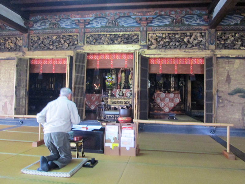 | 興正寺 別院 本堂 (外陣・内陣) 富田林道場として建立され、外陣が内陣に比して大きい。 浄土真宗興正寺派 (浄土真宗本山興正寺) @ 本尊阿弥陀如来立像 (伝鎌倉末) A 親鸞聖人像 B 開山聖人像 C 華園摂信(本寂上人)像 をそれぞれ安置する。 富田林・寺内町の成立と発展の中核寺院です。地元の人からは「御坊さん」(富田林御坊)として親しまれています。 所在: 城之門筋・堺町 (じないまち散策地図) 由来: 応永年間(1394−1412年)に毛人谷(えびたに)御坊に草創。 永禄3年(1560年)に京都・興正寺第14世証秀上人が現在地に移建。 建物の特徴: 城之門筋に表門を開き、鐘楼・鼓楼を構え、本堂・客殿・庫裏などを配する。 表門は桃山調の高いもので、もと桃山城門のひとつが興正寺に寄与されたものをここに移建したと伝えられている。 本堂 寛永15年(1638年)再建。 本堂は江戸時代には寺子屋として利用され、現在の市立富田林小学校の前身である。戦前には開基祭に小学生が学校から参拝し菓子を配り、通りには出店が開いて祭りが催された。 第2次大戦中、大阪市内の平野国民学校の学童疎開受け入れを行った記録が残っている。 山門 薬医門で桃山城城門を旧天満別院から移築されたもの。重文級。城門であった為、通常の寺院山門に比べて建物規模が大きいのが特徴で、馬に跨って通行できる高さを確保したものと言われる。 。 |
