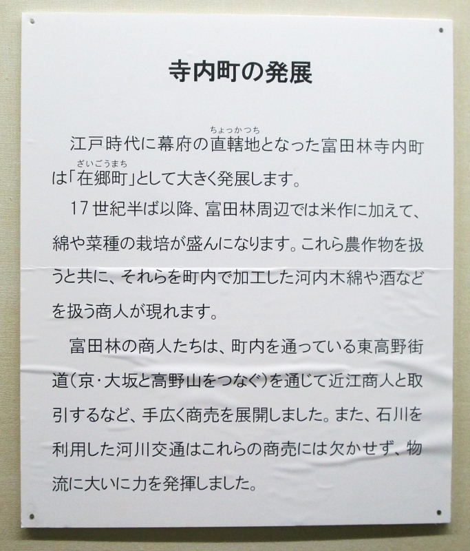 | 商品作物の流通と在郷町としての発展 18世紀に入って近在の村々に綿作りや菜種作りがさかんになるにつれて、その買い集めや加工、取引をする問屋が増えた。富田林は石川谷における産業の中心地として、米をもとにしての酒造りの家、菜種から油をしぼり取る油搾り問屋、木綿から織った河内木綿の問屋などが、元禄・宝永の頃から次第に栄え、大きな店が軒を並べるようになり、各地の商人や近在からの出入りも多く、町場の賑わいは年とともに加わり、商取引も広く大きくなっていった。中世の宗教自治都市・寺内町の性格は次第に失われて、近世地域商業都市・在郷町としての経済発展を遂げることになった。 「河内名所図会」にも以下のように記されている。 「いにしへは富田芝として、広き野にありしが、公命によりて市店建続きて,商人多し、殊には、水勝れて善れば、酒造る業の家多数の軒を並ぶ」 出身の村名を屋号や呼び名として最近まで使われていたものに、平尾屋(越井家)、別井屋(橋本家)、黒山屋(田守家)、新堂屋(北野家)、板持屋、貴志屋(杉本家)、飛鳥屋、岩瀬屋(奥谷家)、坂田屋(田中家)などがある。 |