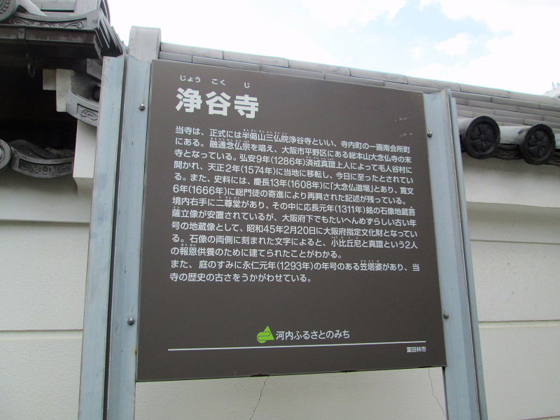 | 当寺は、正式には半偈山(はんけいさん)三仏院(さんぶついん)浄谷寺といい、寺内町の一画、南会所町にある。融通念仏宗を唱え大阪市平野区にある総本山大念仏寺の末寺となっている。弘安9年(1286年)済戒真證上人によって毛人谷村に開かれ、天正2年(1574年)に当地に移転し、今日に至ったとされている。 また、史料には慶長13年(1608年)に「大念仏道場」とあり、寛文6年(1666年)に総門徒の寄進により再興された記述が残っている。境内右手に二尊堂があり、その中に応長元年(1311年)銘の石像地蔵菩薩立像が安置されているが、大阪府下でもたいへんめずらしい古い年号の地蔵像として、昭和45年2月20日に大阪府指定文化財となっている。 石像の両側に刻まれた文字によると、小比丘尼と真證という2人の報恩供養のために建てられたことがわかる。また、庭のすみに永仁元年(1293年)の年号がある笠塔婆があり、当寺の歴史の古さをうかがわせている。 |