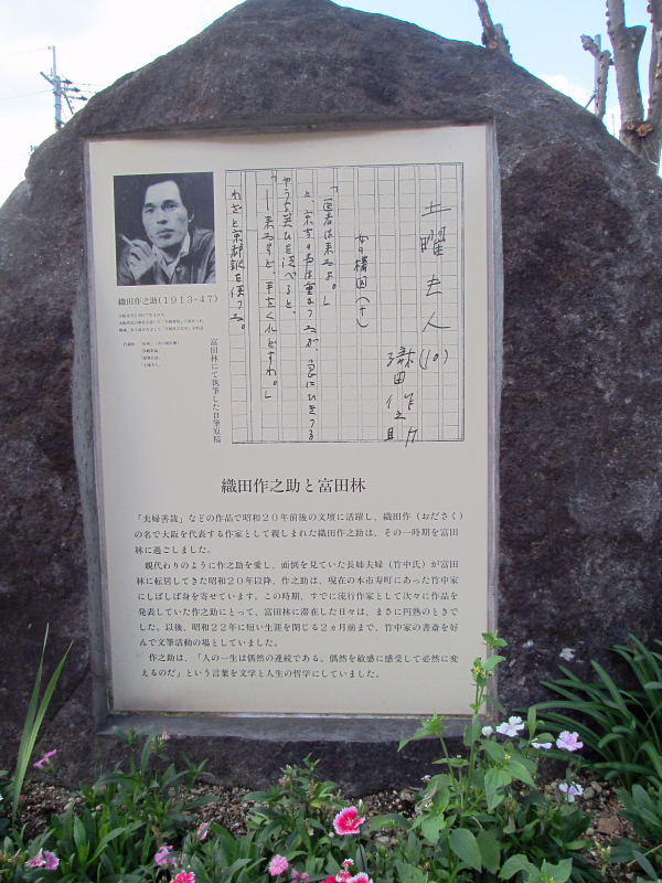 織田作之助の碑 織田作之助は大正2年(1913)大坂に生まれ、昭和22年(1947)亡くなつております。享年33歳、結核の為早世する。 この碑は作之助が富田林に滞在中の昭和21年(1946)亡くなる一年前に書いた「土曜夫人」の原稿であります。 生涯に沢山の小説を書いておりますがその一部に有名な「夫婦善哉」や五代友厚、猿飛佐助などの著書もあります。 |