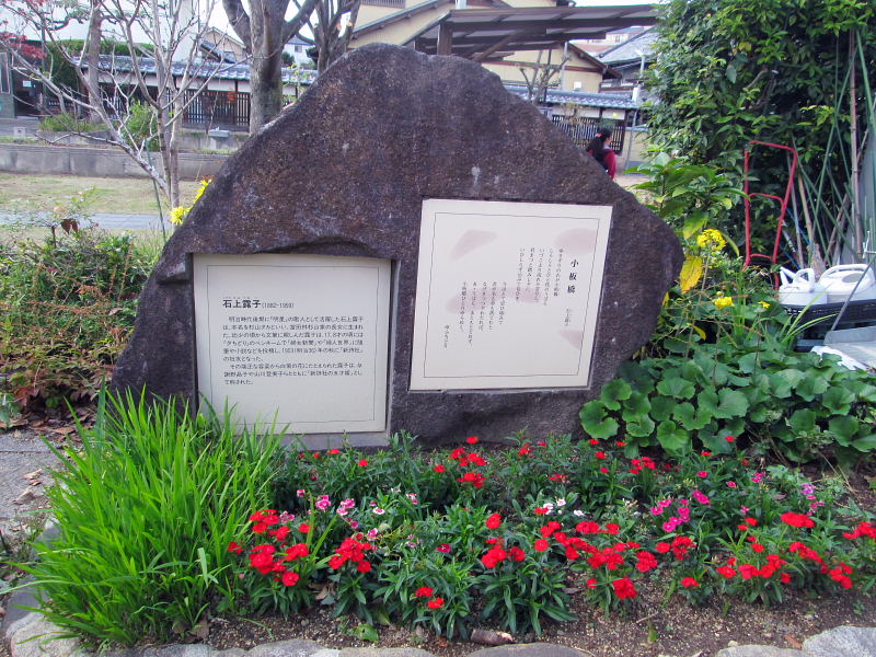 | 石上露子記念碑 本名杉山孝。明治15年(1882年)、南河内一の大地主・杉山家の長女として生まれました。幼時から古典や漢籍、琴などに親しみ、二十歳頃から『明星』などに短歌,詩、小説などを発表しました。雅号は夕ちどり。 古典の教養をもとに、華麗さの中に深い憂いを漂わせた作風で評価され、富田林にいながら明治期の中央歌壇で注目を集め、明治36年に『新詩社』(明星発行の結社)の社友となり、与謝野晶子、山川登美子、茅野雅子、玉野花子とともに「新詩社の五才媛」と称されました。 旧家の家督を継ぐ運命のため、思いこがれた初恋の人に対するかなわぬ思いを詠んだ“小板橋”(下記)は絶唱と評され、石上露子の名を不朽のものにしました。 |