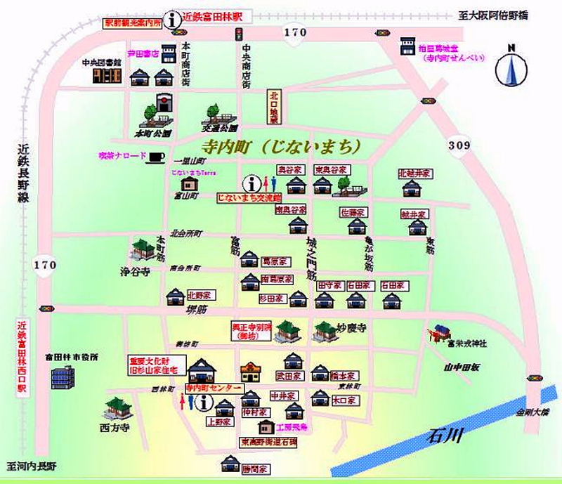 じないまち交流館 (富田林寺内町) じないまち交流館は、富田林寺内町を訪れる方々に寺内町の歴史・文化について様々な情報の提供や市民の交流の場、そして来訪者の休憩場所を提供することなどを目的としています。 施設規模 敷地面積 322,02平方メートル 建築面積 186, 11平方メートル 開館時間:午前10時から午後5時 休刊日 月曜日(月曜日が休日の場合はその翌日)、年末年始(12月28日〜 1月6日) |