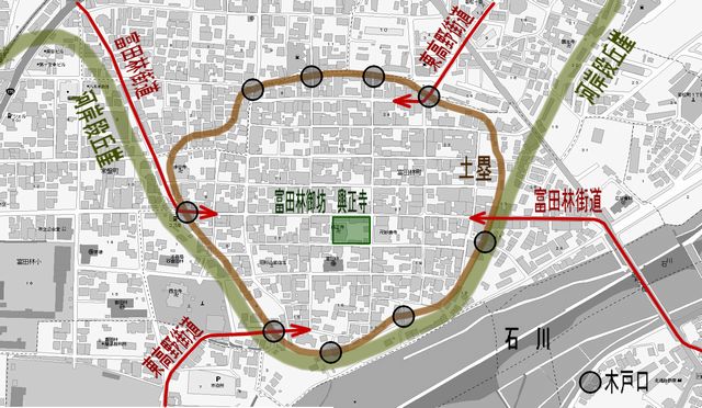 | 織田信長との和平戦略の下で繁栄した富田林寺内町 戦国時代(1467−1562)、寺内町と呼ばれる宗教自治都市が各地に誕生した。寺院の境内に接して形成されたこの都市集落は、大名、領主などの干渉を排して自治を確立していった。いまも奈良県の今井町(橿原市)、大阪府の堺などに寺内町の面影をとどめる町並みが残されているが、そんな中の一つがここ富田林である。 なかでも最も有名な寺内町は、石山本願寺を中心に作られた「大坂寺内町」であるが、織田信長との元亀元年(1570年)からの10年に及ぶ争いで、石山本願寺は信長との戦いに敗れ、徹底的に破壊され、いまでは全くその姿を見ることができない。 これに対して、摂津河内や富田林は信長に対して恭順の意を示し、和平を選択した。各地に残っている寺内町の町並みは、いずれも一向一揆の制圧を目指した織田信長との対立関係の中に融和策を模索して生き残り、後の世の繁栄を勝ち取ったものである。ただし、富田林が今日のような繁栄を獲得した背景には、一向一揆を形成した本願寺門徒を中心とした軍事力があったことは否めない。 |
