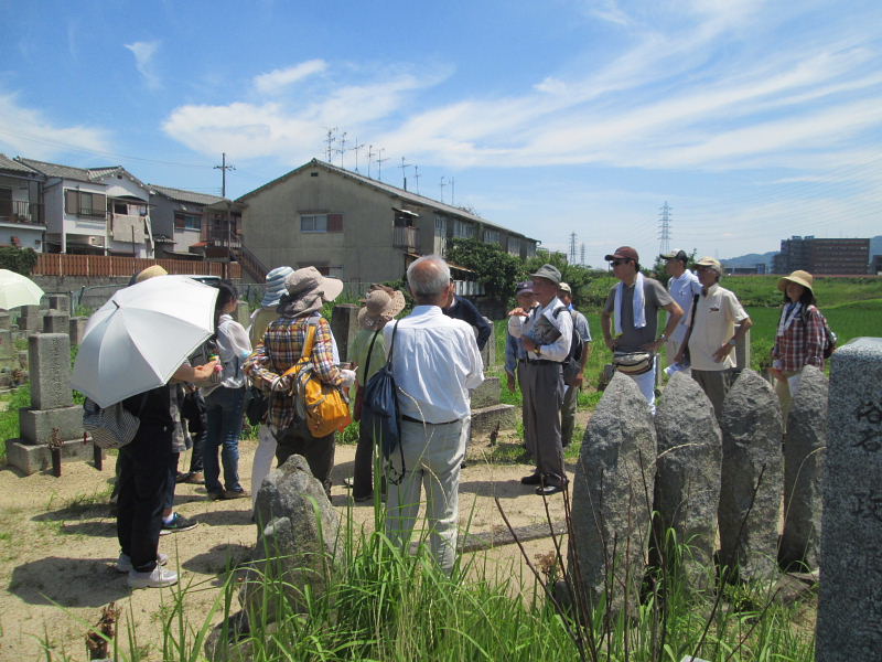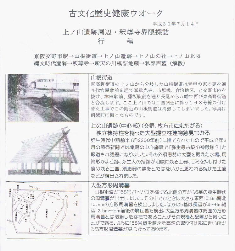 | 7月14日(土)午前9時、京阪交野市駅ロータリ前に集合。 6月18日の「大阪北部地震」、7月4日から降り続いて各地に大きな災害をもたらした「西日本豪雨災害」など、その後一転して35℃を超える炎天下が続き、ウォーク当日も猛暑が照り付ける中、会員16名とゲスト8名の総勢24名の皆さんが参加され、最後まで元気に歩き通されました。 案内役の高尾さんが事前に下見をして頂き、無理のないコースを組んでいただきました。 お陰様で、皆さんと一緒に猛暑の中、上ノ山遺跡周辺散策と釈尊寺界隈探訪をゆっくりと楽しめました。心より感謝申し上げます。 また、ホームページの記載に当たり、講師の高尾さんより詳しいレジメを頂きましたこと重ねて御礼申し上げます。 |