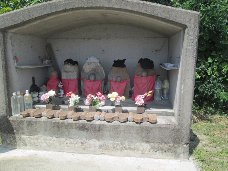 ![]() 釈尊寺バス停前に整然として地蔵尊が祀られています。 |