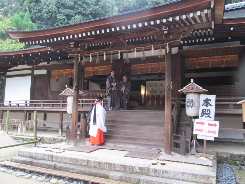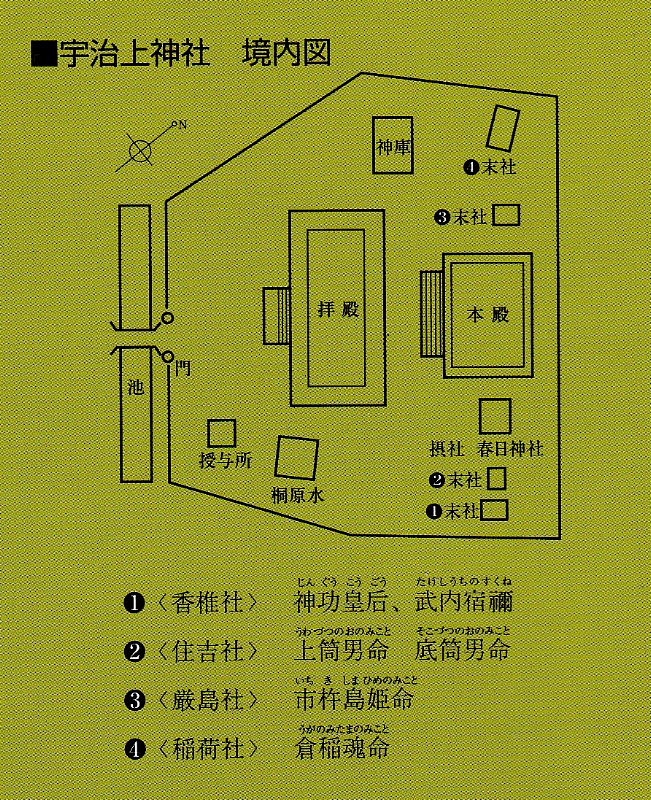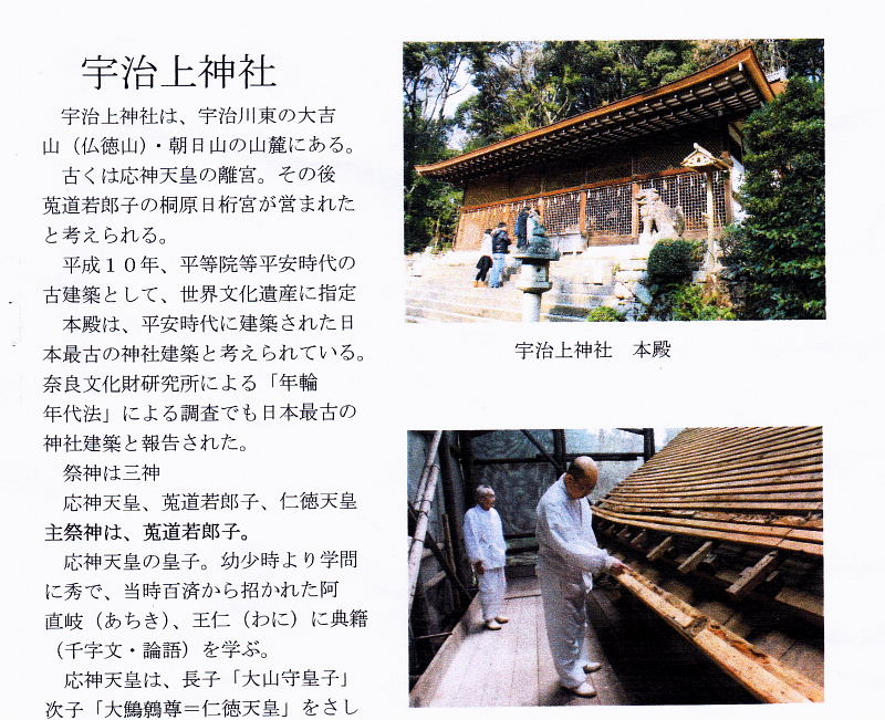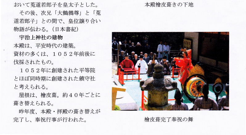 | 宇治上神社は、宇治川東の大吉山(仏徳山)・朝日山の山麓にある。 古くは応神天皇の離宮。その後、莵道稚郎子(うじのわきいらつこ)の桐原日桁宮(きりはらひけたのみや)が営まれたと考えられる。 平成10年、平等院等平安時代の古建築として、世界文化遺産に指定、本殿は、平安時代に建築された日本最古の神社建築と考えられている。 奈良文化財研究所による「年輪年代法」による調査でも日本最古の神社建築と報告された。 祭神は三神 応神天皇、莵道稚郎子(うじのわきいらつこ)、仁徳天皇 主祭神は、菟道稚郎子。 応神天皇の皇子。幼少時より学問に秀で、当時百済から招かれた阿直岐(あちき)、王仁(わに)に典籍(千字文・論語)を学ぶ。 応神天皇は、長子「大山守皇子」次子[大鷦鷯尊(おおさざきのみこと)=仁徳天皇]をさしおいて、菟道稚郎子を皇太子とした。 その後、次兄「大鷦鷯尊」と「菟道若郎子」との間で、皇位譲り合い物語が伝わる。(日本書紀) 宇治上神社の建物 本殿は、平安時代の建築。資材の多くは、1052年前後に伐採されたもの。 1052年に創建された平等院とほぼ同時期に創建された鎮守社と考えられる。 屋根は、檜皮葺。約40年ごとに葺き替えられる。 昨年度、本殿・拝殿の葺き替えが完了し、奉祝行事が行われた。 |