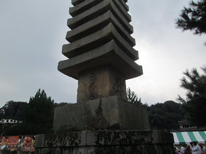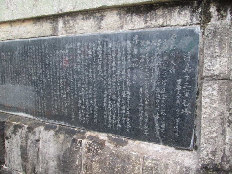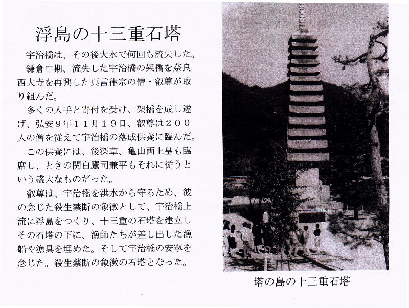 | 宇治橋は、その後大水で何回も流失した。鎌倉中期、流失した宇治橋の架橋を奈良西大寺を再興した真言律宗の僧・叡尊が取り組んだ。 多くの人手と寄付を受け、架橋を成し遂げ、弘安9年11月19目、叡尊は200人の僧を従えて宇治橋の落成供養に臨んだ。 この供養には、後深草、亀山両上皇も臨席し、ときの関白鷹司兼平もそれに従うという盛大なものだった。 叡尊は、宇治橋を洪水から守るため、彼の念じた殺生禁断の象徴として、宇治橋上流に浮島をつくり、十三重の石塔を建立しその石塔の下に、漁師たちが差し出した漁 船や漁具を埋めた。そして宇治橋の安寧を念じた。殺生禁断の象徴の石塔となった。 |