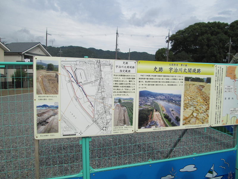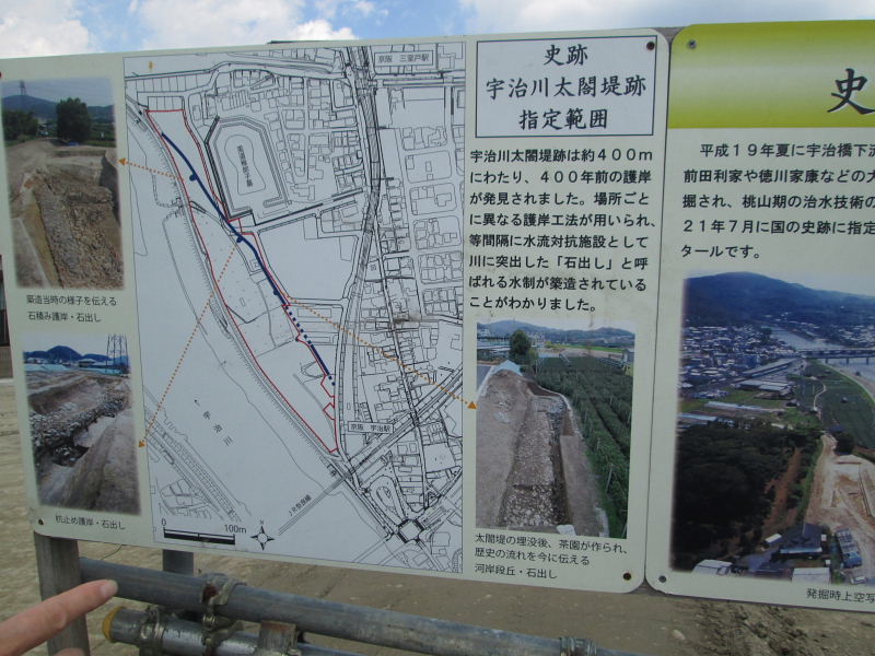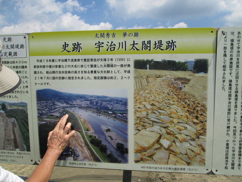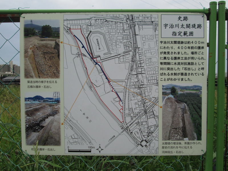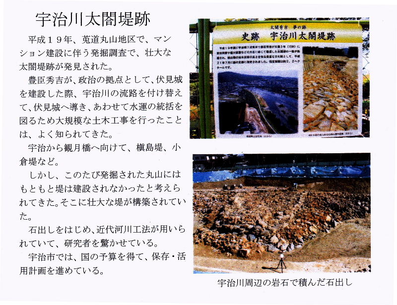 | 平成19年、菟道丸山地区で、マンション建設に伴う発掘調査で、壮大な太閤堤防が発見された。 豊臣秀吉が、政治の拠点として、伏見城を建設した際、宇治川の流路を付け替えて、伏見城へ導き、あわせて水運の統括を図るため大規模な土木工事を行ったことは、よく知られてきた。 宇治から観月橋へ向けて、槙島堤、小倉堤など。 しかし、このたび発掘された丸山にはもともと堤は建設されなかったと考えられてきた。そこに壮大な堤が構築されていた。 石出しをはじめ、近代河川工法が用いられていて、研究者を驚かせている。 宇治市では、国の予算を得て、保存・活用計画を進めている。平成21年7月国史跡に指定。 |