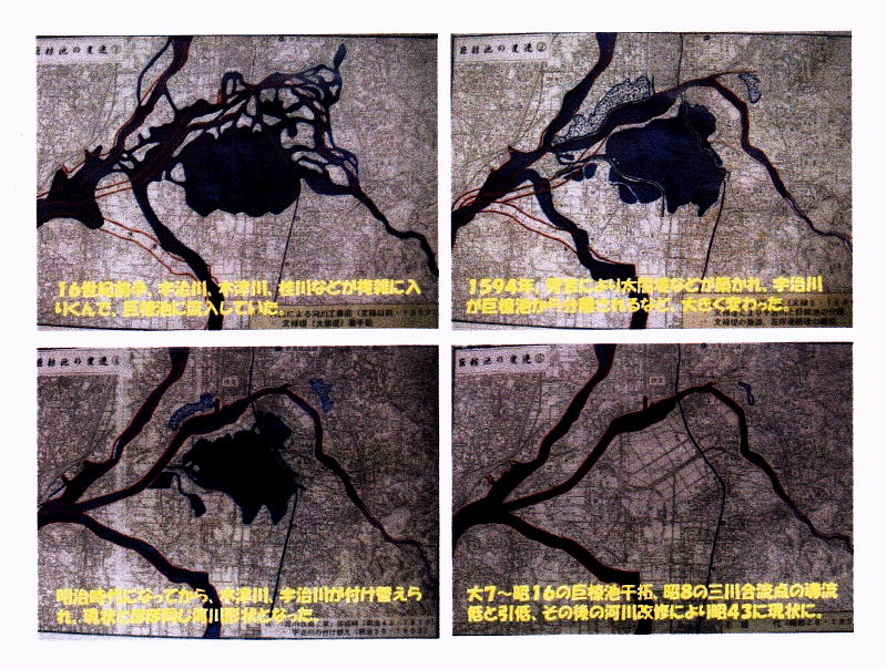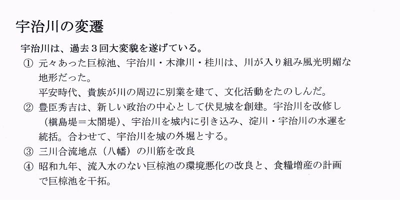 宇治川は、過去3回天変貌を遂げている。 @元々あった巨椋他、宇治川・木津川・桂川は、川が入り組み風光明媚な地形だった。 平安時代、貴族が川の周辺に別業を建て、文化活動をたのしんだ。 A豊臣秀吉は、新しい政治の中心として伏見城を創建。宇治川を改修し(槙島堤=太閤堤)、宇治川を城内に引き込み、淀川・宇治川の水運を統括。合わせて、宇治川を城の外堀とする。 B三川合流地点(八幡)の川筋を改良 C昭和九年、流入水のない巨椋他の環境悪化の改良と、食糧増産の計画で巨椋池を干拓。 |