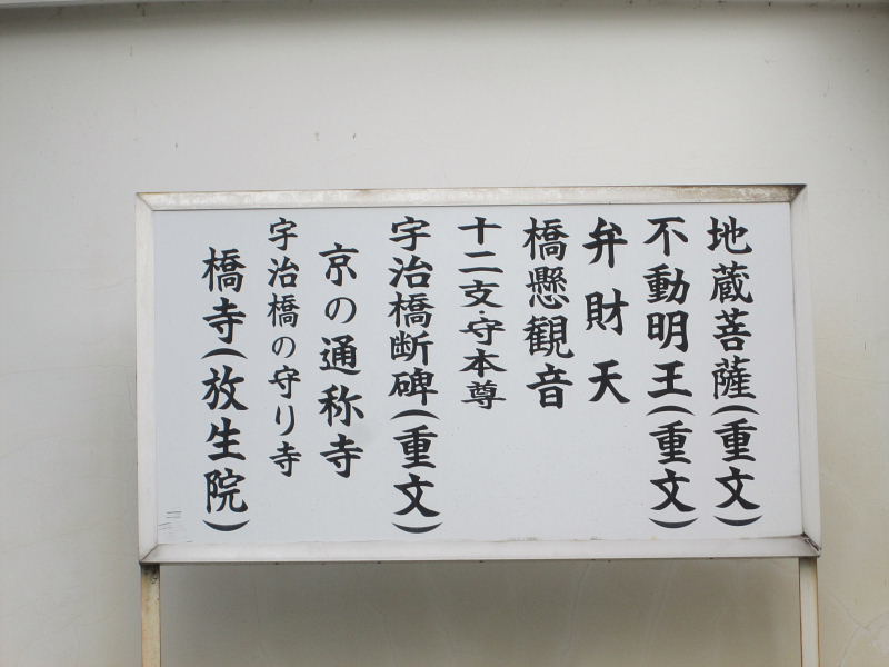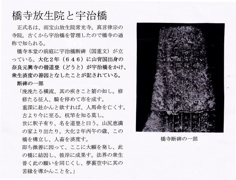 | 正式名は、雨宝山放生院常光寺。真言律宗の寺院。古くから宇治橋を管理したので橋寺の通称で知られる。 橋寺本堂の前庭に宇治橋断碑(国重文)が立っている。大化2年(646)に山背国出身の奈良元興寺の僧道登(どうと)が宇治橋をかけ、衆生済度の善因となしたことが記されている。 断碑の一部 「??たる横流、其の疾きこと箭の如し、修修たる征人、騎を停めて市を成す。 重深に赴かんと欲すれば、人馬命を亡くす。古より今に至る。杭竿を知る莫し。 ![]() 既に釈子有り、名を道登と日う。出尻恵満の家より出たり。大化2年丙午の歳、 この橋を構立し、人畜を済度す。 即ち微善に因って、ここに大願を発し、此の橋に結因し、彼岸に成果す。 法界の衆生 普く此の願いを同じくし、夢裏空中に其の苦縁を導かんことを。」 べんべんたる横流、その疾きこと矢のごとし、しゅうしゅうたる征人、馬を停め市を成す、 重深に赴かんとすれど、人馬命を失う、古より今に至るまで、こういを知るもなし、 世に釈子あり、名を道登と曰く、山尻恵満の家より出でたり、 大化二年丙午の歳、此の橋を構立し、人畜を済度す、 即ち微善に因って、ここに大願を発す、因をこの橋に結び、果を彼の岸に成さん、 法界の衆生あまねくこの願いを同じゅし、夢裏空中にその苦縁を導かんことを |