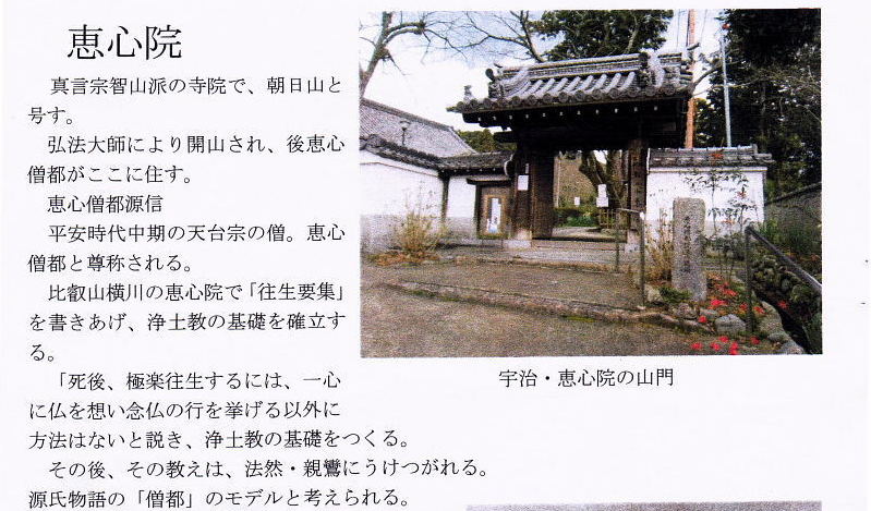 | 真言宗智山沢の寺院で、朝日山と号す。 弘法大師により開山され、後恵心僧都がここに住す。 恵心僧都源信、平安時代中期の天台宗の憎。恵心僧都と尊称される。 比叡山横川の恵心院で「往生要集」を書きあげ、浄土教の基礎を確立する。 死後、極楽往生するには、一心に仏を想い念仏の行を挙げる以外に方法はないと説き、浄土教の基礎をつくる。その後、その教えは、法然・親鸞にうけつがれる。 源氏物語の「僧都」のモデルと考えられる。 |