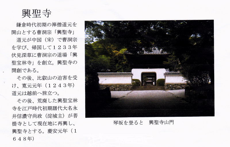 | 鎌倉時代初期の禅僧道元を開山とする曹洞宗「興聖寺」。道元が中国(宋)で曹洞宗を学び、帰国して1233年伏見深草に曹洞宗の道場「興聖宝林寺」を創立。興聖寺の開創である。 その後、比叡山の迫害を受け、寛元元年(1243年)道元は越前へ旅立つ。 その後、荒廃した興聖宝林寺を江戸時代初期譜代大名永井信濃守尚政(淀城主)が菩提寺として現在地に再興し、興聖寺とする。慶安元年(1648年)。 |