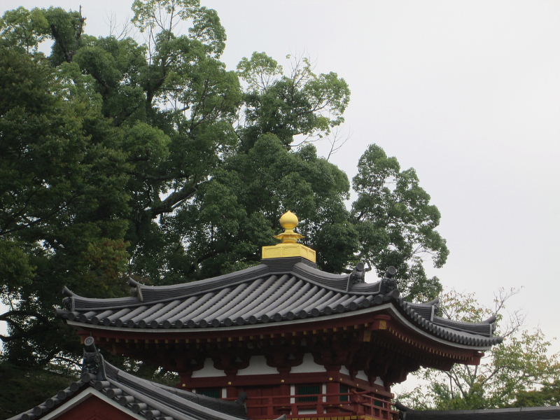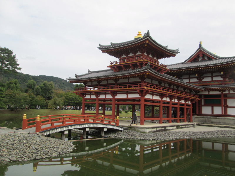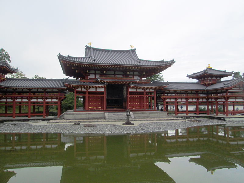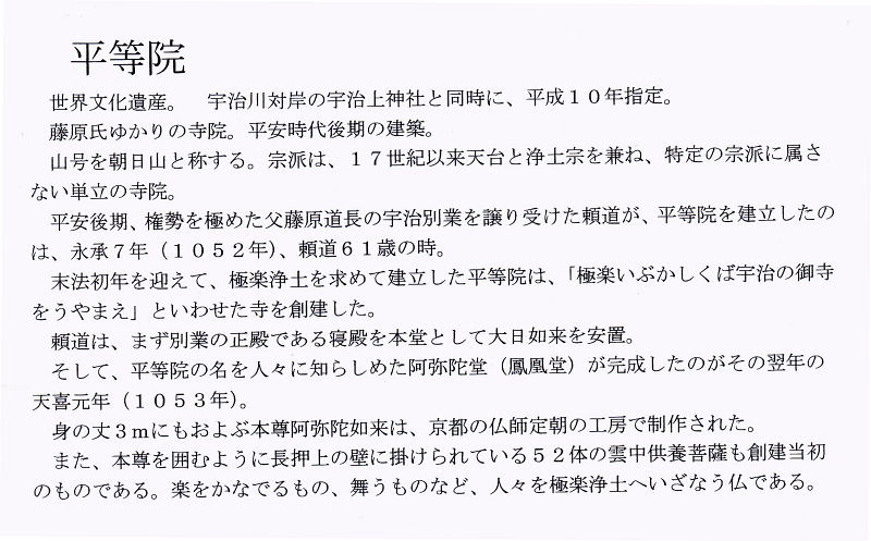 | 世界文化遺産。 宇治川対岸の宇治上神社と同時に、平成10年指定。 藤原氏ゆかりの寺院。平安時代後期の建築。 山号を朝日山と称する。宗派は、17世紀以来天台と浄土宗を兼ね、特定の宗派に属さない単立の寺院。 平安後期、権勢を極めた父藤原道長の宇治別業を譲り受けた頼道が、平等院を建立したのは、永承7年(1052年)、頼道61歳の時。 末法初年を迎えて、極楽浄土を求めて建立した平等院は、「極楽いぶかしくば宇治の御寺をうやまえ」といわせた寺を創建した。頼道は、まず別業の正殿である寝殿を本堂として大日如来を安置。 そして、平等院の名を人々に知らしめた阿弥陀堂(鳳凰堂)が完成したのがその翌年の天喜元年(1053年)。 身の丈3mにもおよぶ本尊阿弥陀如来は、京都の仏師定朝の工房で制作された。 また、本尊を囲むように長押上の壁に掛けられている52体の雲中供養菩薩も創建当初のものである。楽をかなでるもの、舞うものなど、人々を極楽浄土へいざなう仏である。 |