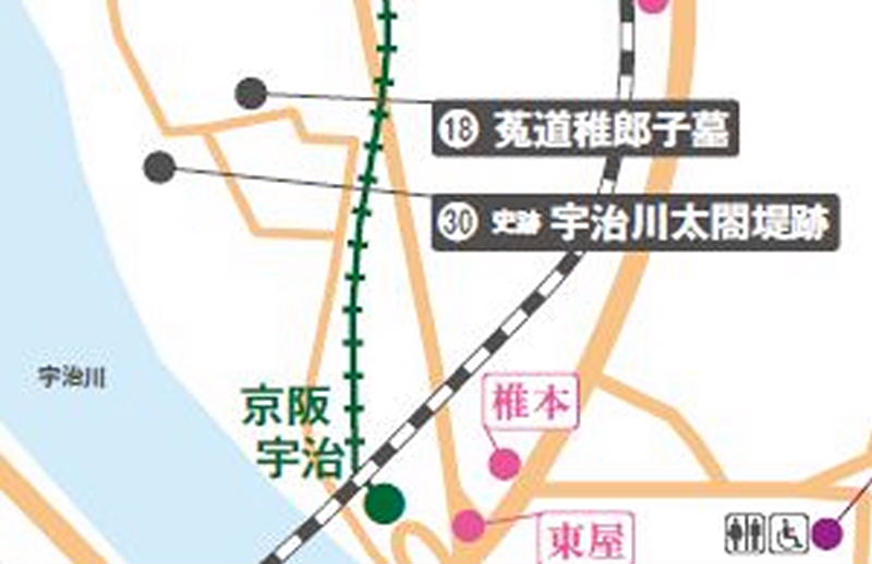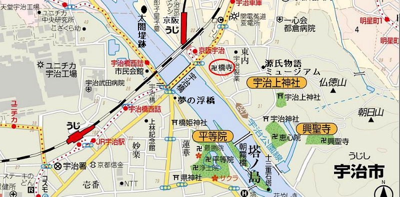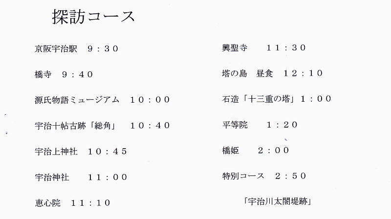 | 行程 :京阪交野市駅(午前8時30分)集合→ 枚方市駅→中書島 → 宇治駅9:30 → 宇治橋 → 橋寺 → 源氏物語ミュージアム → 宇治上神社 → 宇治神社 → 恵心寺 → 興聖寺 → 塔の島(昼食) → 十三重の塔 → 平等院 → 夢の浮橋 → 太閤堤跡 → 菟道稚郎子墓 →京阪・宇治駅 (3時過ぎ解散) 徒歩 約6.5km |