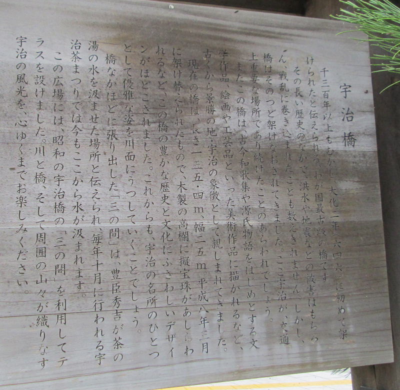 | 宇治橋 1300年も昔、大化二年(646)に初めて架けられたと伝えられる、我国最古の橋です。 その長い歴史の中で、洪水や地震などの被害はもちろん、戦乱に巻き込まれたことも数え切れません。しかし、橋はその都度架け直されてきました。ここ宇治が、交通上重要な場所であり続けたことの現れでしょう。 またこの橋は古今和歌集や源氏物語をはじめとする文学作品、絵画や工芸品といった美術作品に描かれるなど、古くから景勝の地・宇治の象徴として親しまれてきました。 現在の橋は、長さ155.4m、幅25m、平成8年3月に架け替えられたもので、木製の高欄に擬宝珠があしらわれるなど、この橋の豊かな歴史と文化にふさわしいデザインが施されました。これからも宇治の名所の一つとして優雅な姿を川面にうつしてゆくことでしょう。 橋中ほどに張り出した「三の間」は、豊臣秀吉が茶の湯の水を汲ませた場所と伝えられ、毎年10月に行われる宇治茶まつりでは今もここから水が汲まれています。 この広場には、昭和の宇治橋の「三の間」を利用して、テラスを設けました。川と橋、そして周囲の山々が織りなす宇治の風景を、心ゆくまでお楽しみ下さい。 |