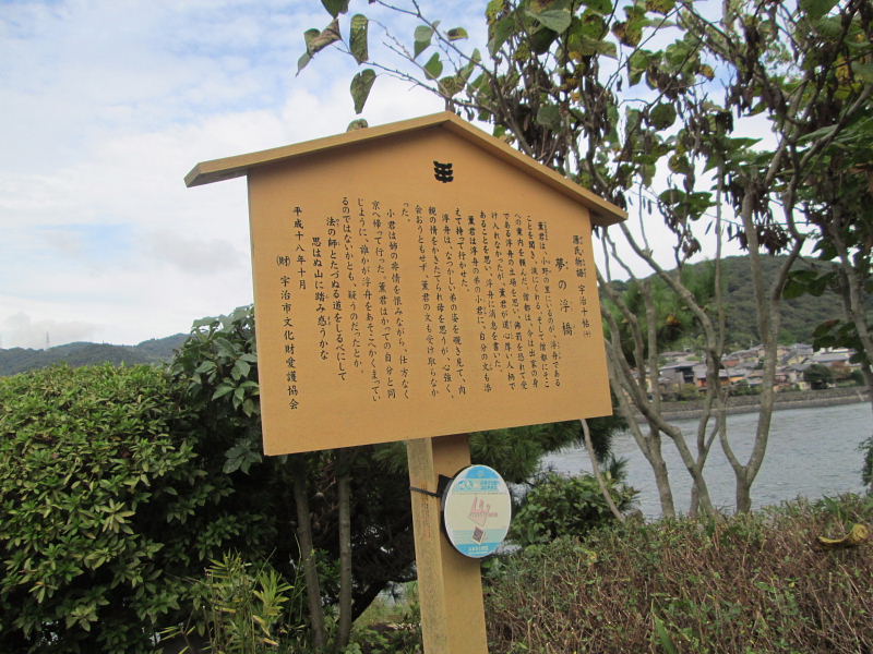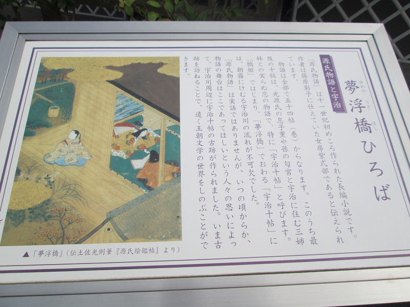 | 宇治十帖「夢浮橋」(第54帖)の古跡と紫式部の像 紫式部が著した全編54帖からなる源氏物語のうち、最末尾にあたる第3部のうち後半の「橋姫」から「夢浮橋」までの最後の10帖は宇治を主な舞台にしており、通称「宇治十帖」と呼ばれています。 -宇治十帖- 第45帖 橋姫(はしひめ) 第46帖 椎本(しいがもと) 第47帖 総角(あげまき) 第48帖 早蕨(さわらび) 第49帖 宿木(やどりぎ) 第50帖 東屋(あづまや) 第51帖 浮舟(うきふね) 第52帖 蜻蛉(かげろう) 第53帖 手習(てならい) 第54帖 夢浮橋(ゆめのうきはし) 宇治橋を中心とした宇治川の両岸に、後世、そのゆかりの古跡が定められ、石碑などが建てられています。 |