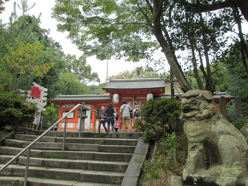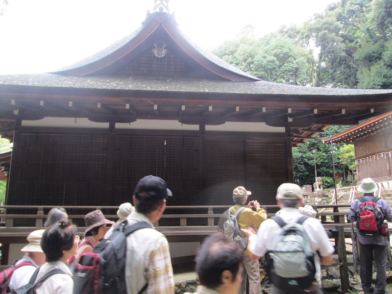 | 宇治上神社を含めて、離宮社とされていた。祭神は莵道稚郎子(うじのわきいらつこ)。本殿は鎌倉時代のもので、他に木造狛犬や白色尉面など貴重な文化財が伝わっています。 ここでは、狛犬について、いろいろと面白いお話をしていただきました。 |