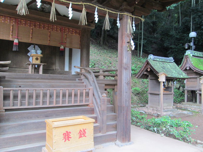 ![]() 覆屋とその中に並列して収まる内殿三社が、神社建築として 日本最古の遺構である。建築年代は年輪年代測定法により、1060年と判定せられる。 |
