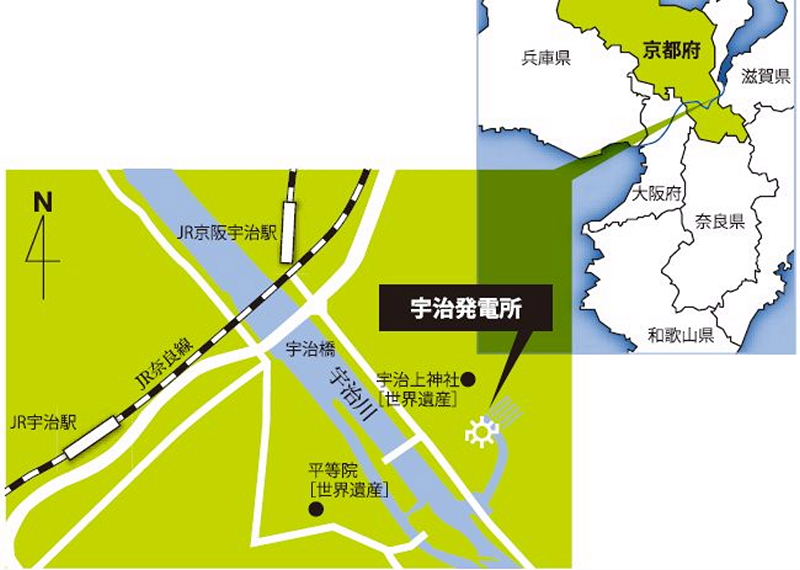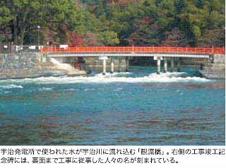 大容量水力発電所の草分けとして今も現役 興聖寺へ向かう手前、朱色に塗られた橋の下から物凄い勢いで宇治川に注いでいる川の上手にあります。 |