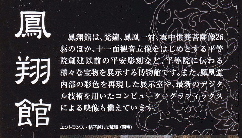 | 平等院鳳凰堂は、建築・彫刻・絵画・工芸が一体化し、国内では最も密度の高い国宝の集積空間です。 さらにその周囲は、国内でも数少ない浄土庭園の遺構がひろがり、建築と庭園が融合したたぐい稀な歴史的環境を今日に伝えています。 1965年に竣功した宝物館は、長らく扉絵、鳳凰、梵鐘、雲中供養菩薩像などの国宝物を収蔵・公開するという重要な役割をはたしてきましたが、老朽化が進み、新しく博物館として鳳翔館を開館しました。 新しい宝物館は、このすぐれた環境のもと、国宝の美術工芸品を良好な状態に収蔵・公開するとともに、鳳凰堂を中心とした境内環境の一部として整備されます。 平等院は、宗教法人としては初の総合博物館(登録博物館)となる「鳳翔館(ほうしょうかん)」を2001年(平成13年)3月1日(木)に開館しました。 |