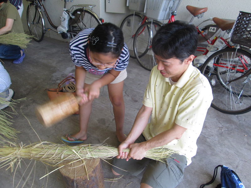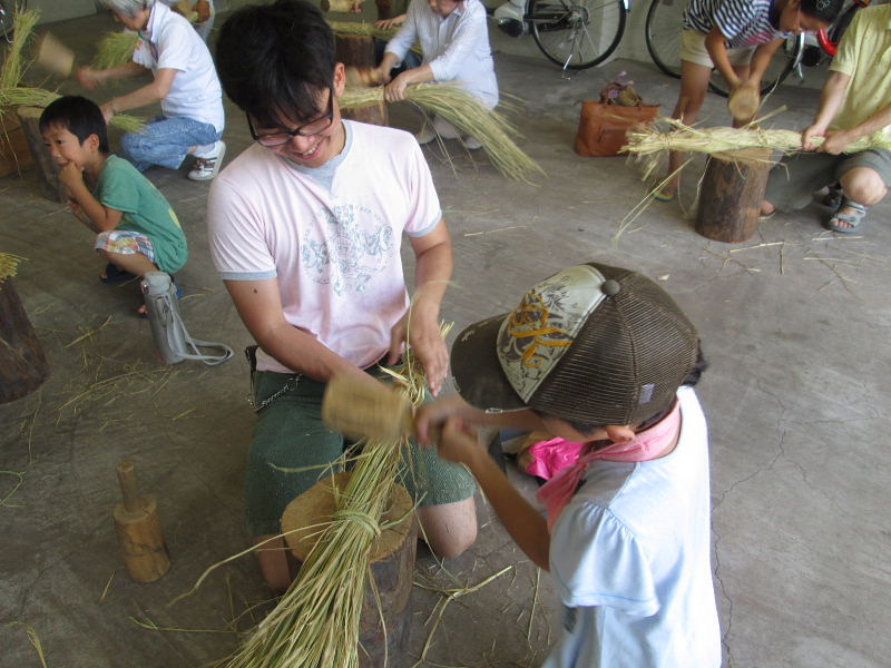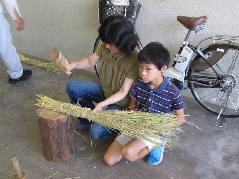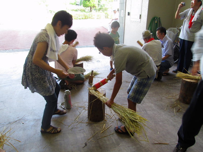 | 左手でしっかりと藁を持ち、木づちで柔らかくなるまで打ちました | |