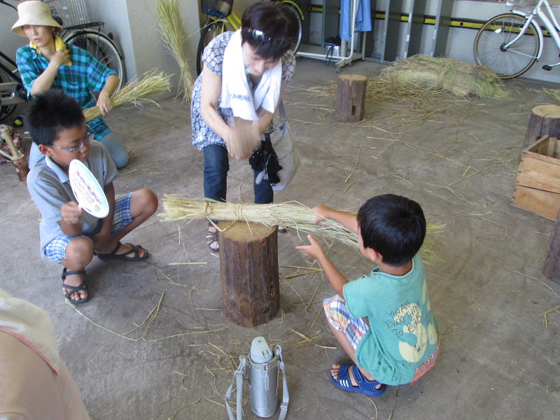 | 藁草履作りは、先ず藁打ちから始まる 元気な子供たちが初めての藁打ちを経験しました! |