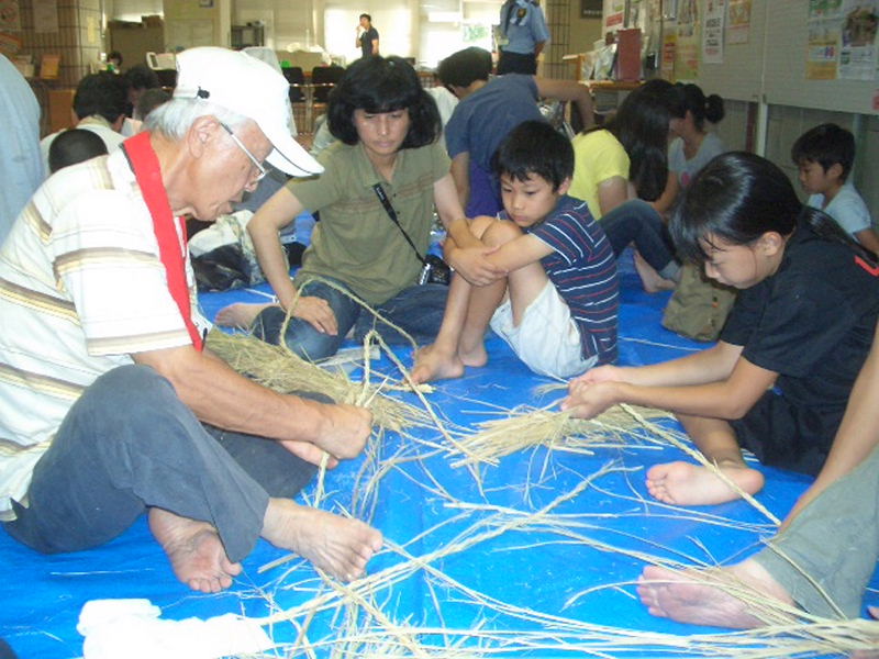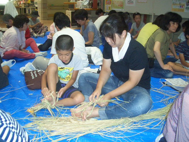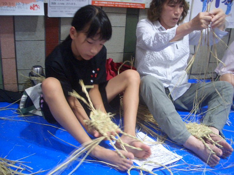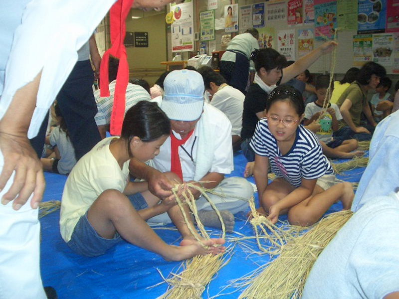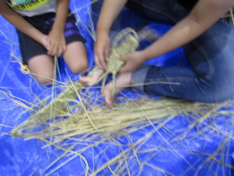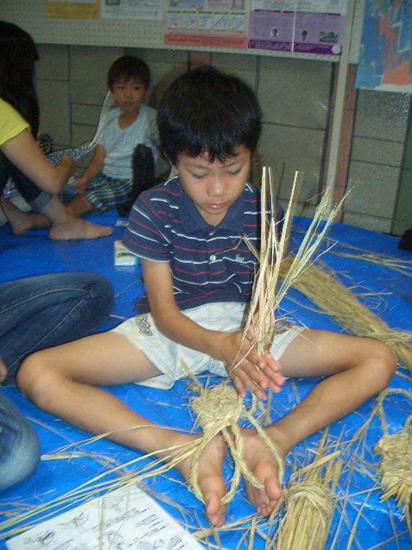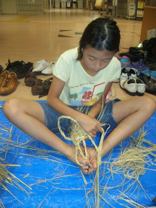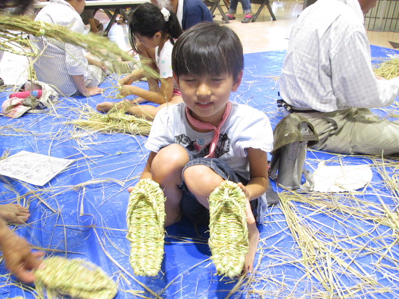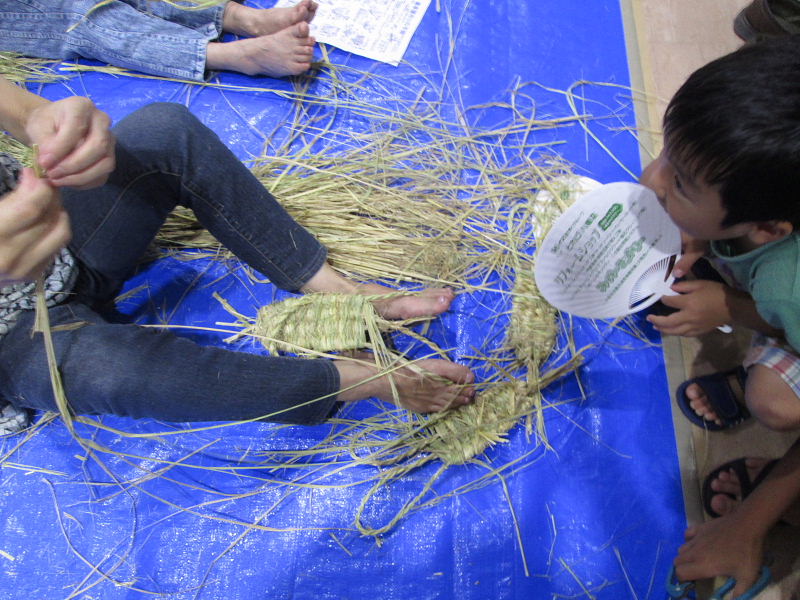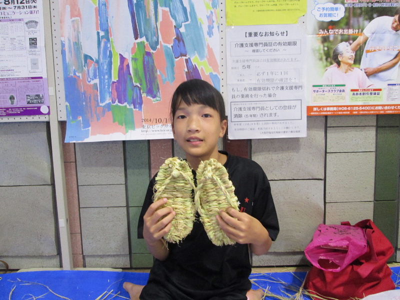 夏休み早々、お母さん、お父さん、おばあさん、おじいさんと沢山の小学生が参加、 NHK朝の連続ドラマ「花子とアン」で、わら草履づくりに興味を覚え、 自分で作って履いてみたいと、一生懸命草履作りに挑戦しました。 |