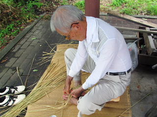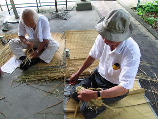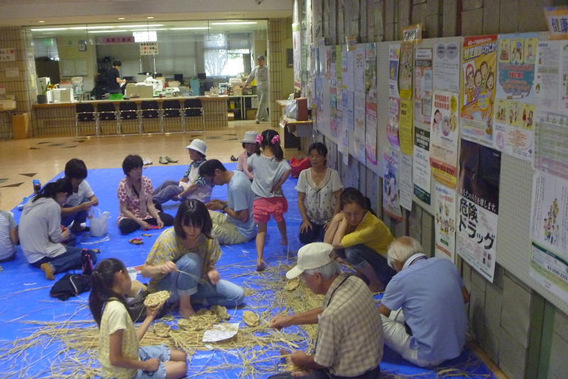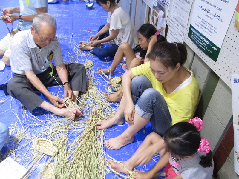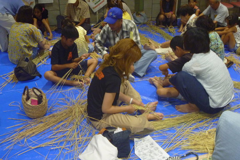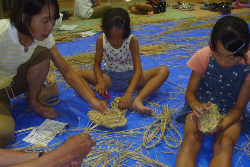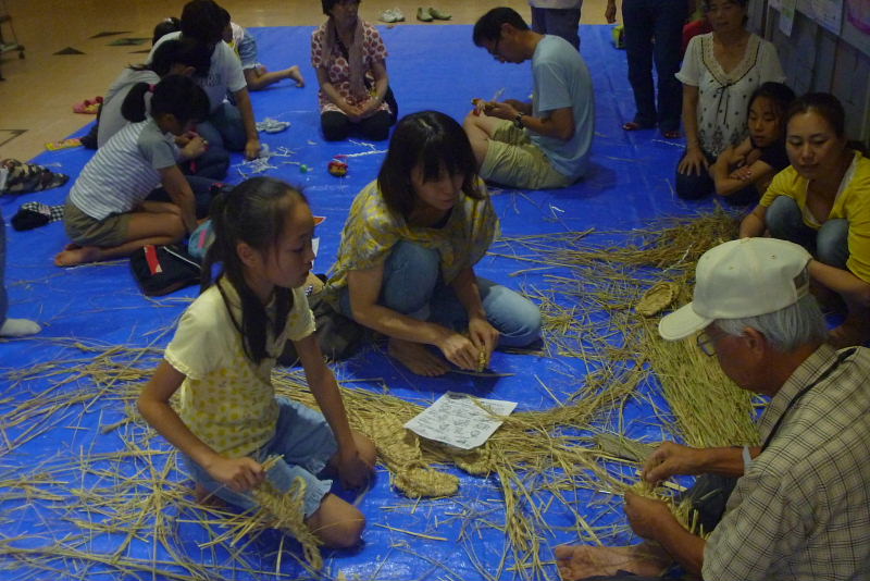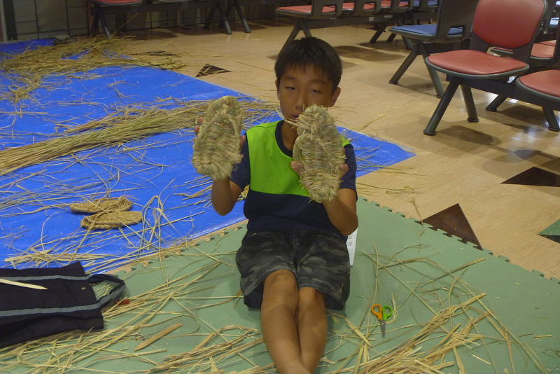 夏休み早々、お母さん、お父さん、おばあさん、おじいさんと沢山の小学生が参加、 自分で作って履いてみたいと、一生懸命草履作りに挑戦しました。 |