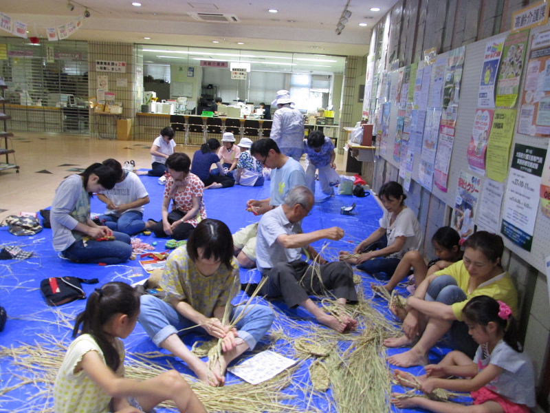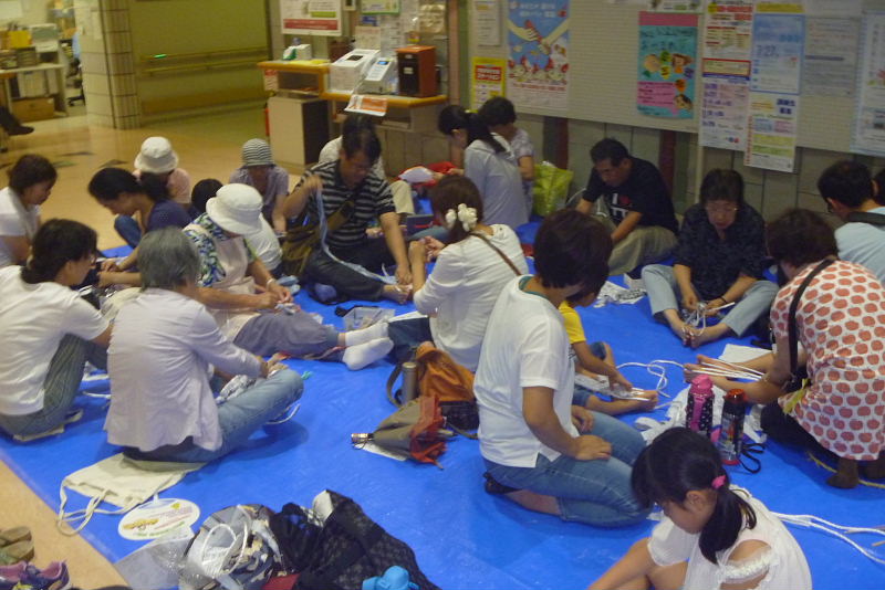 また、「布ぞうり作り」には、15名の市民の皆さんが参加され、 午前中には全部出来上がらなくて、午後も定刻の3時まで楽しく挑戦されました。 特に、布草履作りは女性に人気が高く、色とりどりの布草履作りに挑戦された。 綺麗に出来上がった布草履に、沢山の方が歓声を挙げられた。 夏休み早々、お母さん、お父さん、おばあさん、おじいさんと沢山の小学生が参加、 自分で作って履いてみたいと、一生懸命草履作りに挑戦しました。 交野古文化同好会のスタッフ10名の協力を得て無事終了しました。 連日の猛暑日の中、皆さん、大変ご苦労様でした! |