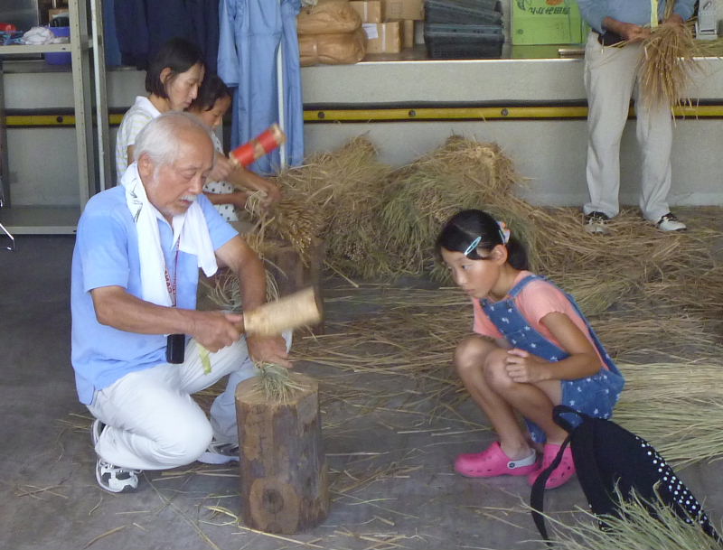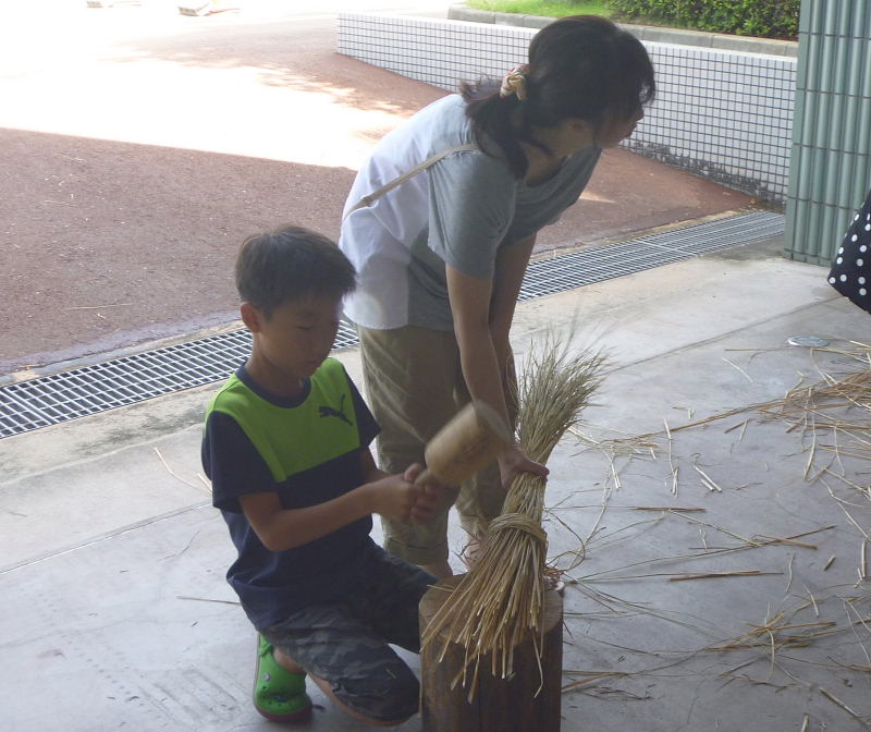 | 藁草履作りは、先ず藁打ちから始まる 元気な子供たちが初めての藁打ちを経験しました! |