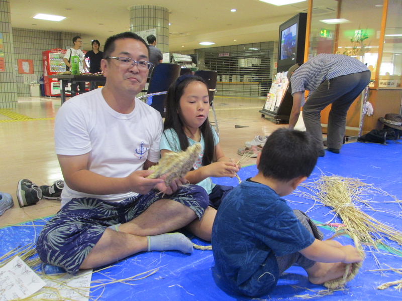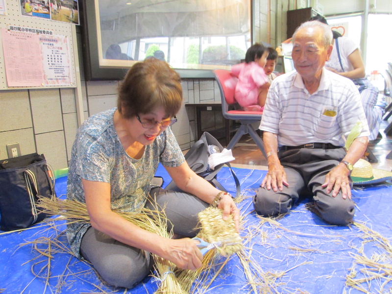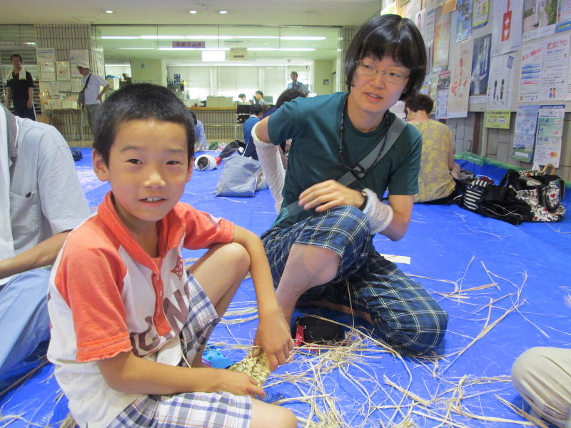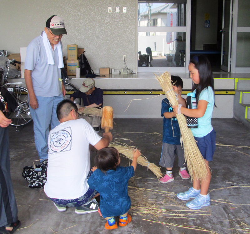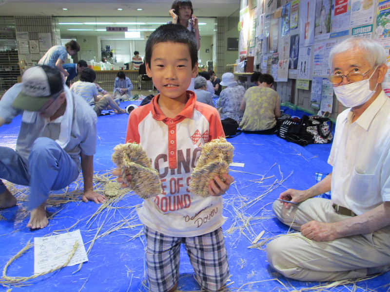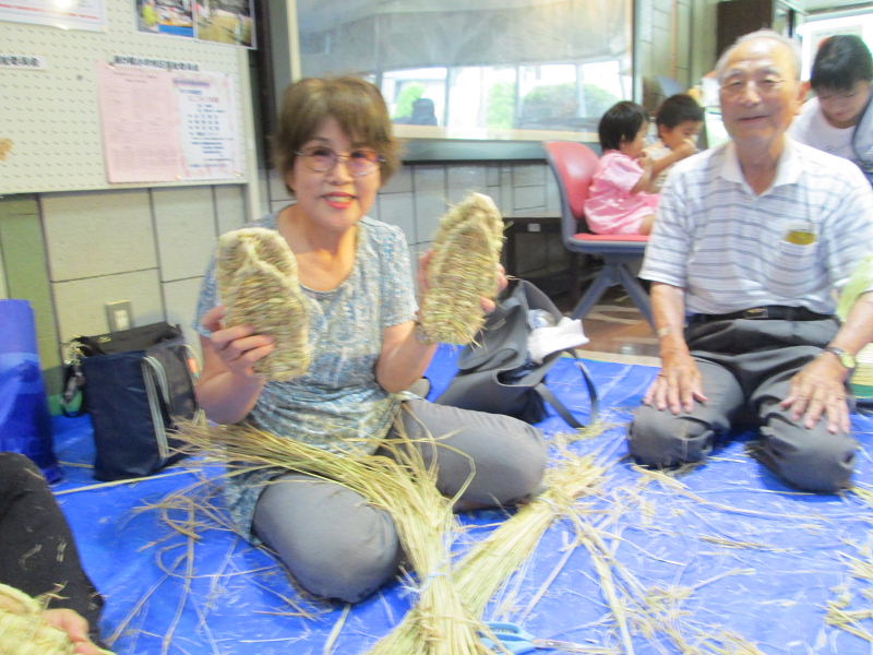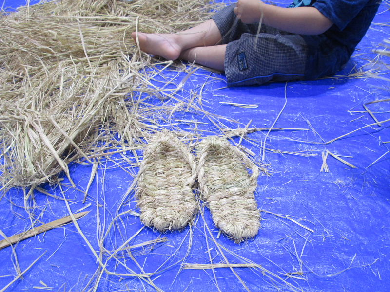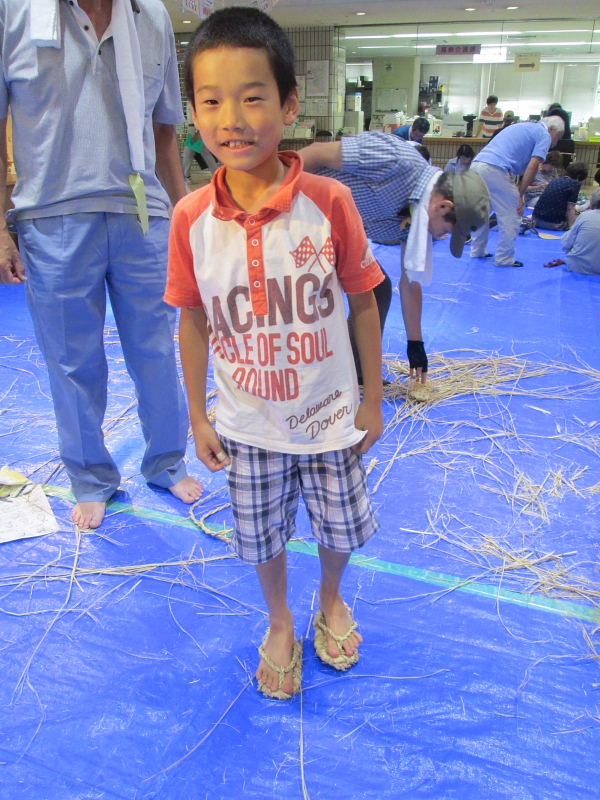 夏休み早々、お母さん、お父さん、おばあさん、おじいさんと沢山の小学生が参加、 自分で作って履いてみたいと、一生懸命草履作りに挑戦しました。 |