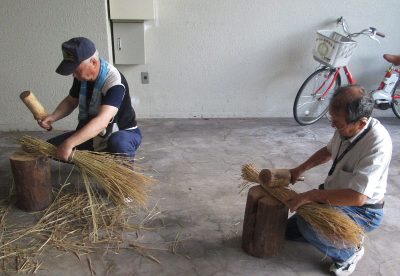 | しっかりと藁を持ち、木づちで柔らかくなるまで打ちました | |