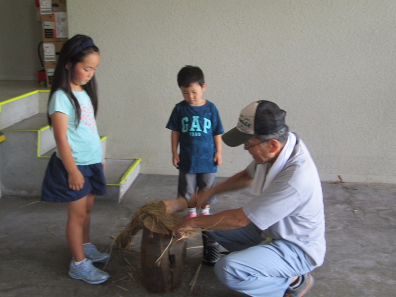 | 藁草履作りは、先ず藁打ちから始まる 元気な子供たちが初めての藁打ちを経験しました! |