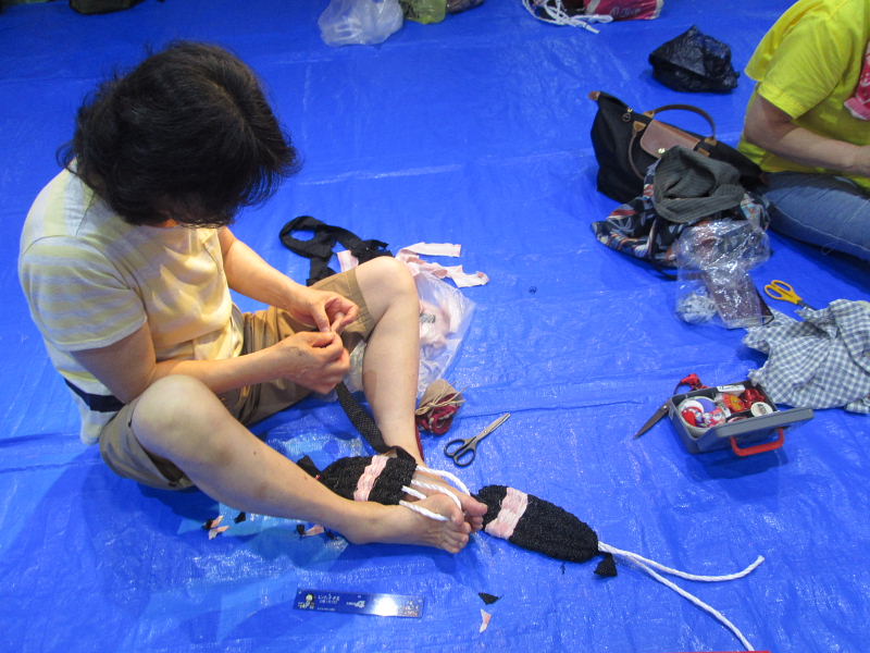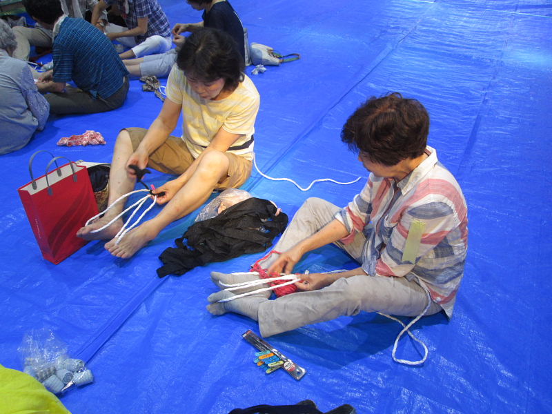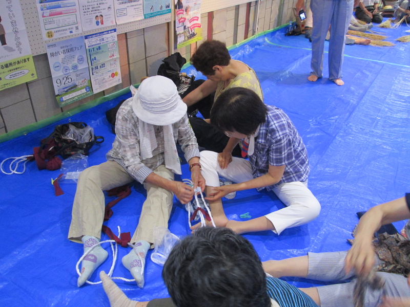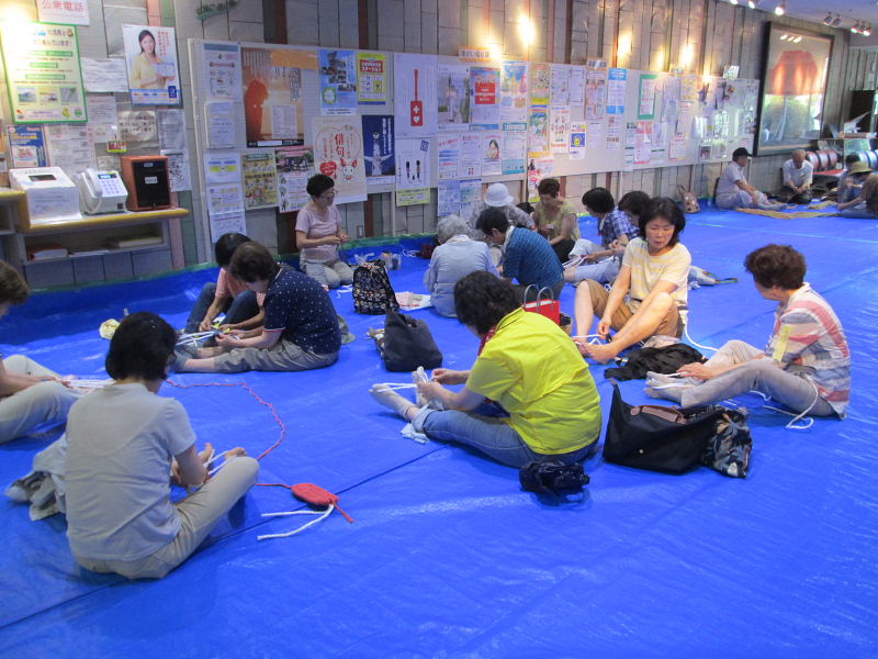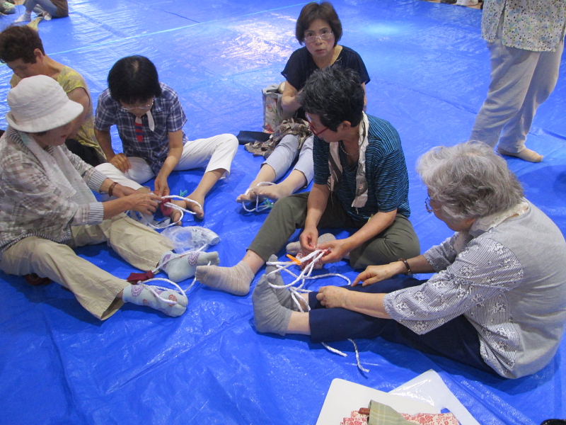 また、「布ぞうり作り」には、12名の市民の皆さんが参加され、 午前中に引き続き、午後も定刻の3時頃まで楽しく挑戦されました。 特に、布草履作りは女性に人気が高く、色とりどりの布草履作りに挑戦された。 綺麗に出来上がった布草履に、沢山の方が歓声を挙げられた。 夏休み早々、お母さん、お父さんと沢山の小学生が参加、 自分で作って履いてみたいと、一生懸命草履作りに挑戦しました。 交野古文化同好会のスタッフ16名の協力を得て無事終了しました。 連日の猛暑日の中、皆さん、大変ご苦労様でした! |
