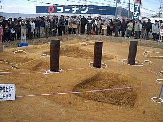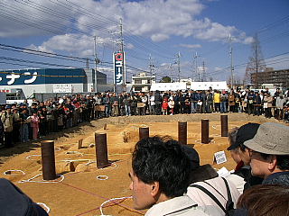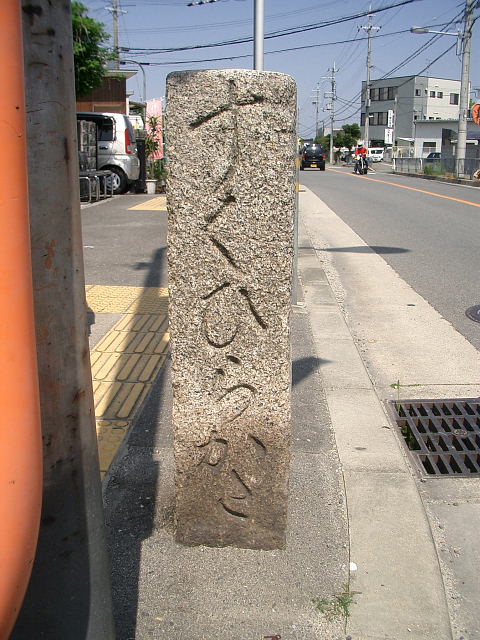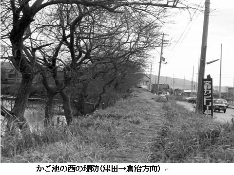 津田駅から南に下がり、府道久御山線の左手にあり、以前は焼肉店フェストで現在、関西スーパーが建築中であるが、ここに大きな「籠池(かご池)」があった。近くで良質の粘土が採集できず、はがね(粘土のフィルムで池の側面を覆うこと)が施されず、水位が増すと、かごに入れた水のように水が漏れたためにこの名がついたという。そして直ぐ西の外池に流れ込んでいた。 久御山線沿いにかご池跡石碑があり、「石つき唄」が彫られている。 「わしの若いときゃ 津田までかよた 倉治かご池で夜が明けた おもしろや おもしろひょうたんや おおあげおおあげ」 この唄は昔、倉治の「若い衆」が晩、津田の女性の宅に遊びに行くことが楽しみやった。時間も遅くなって帰って、ここの堤に来たら交野山の頂きに朝日が上りかけていたという歌詞で、お嫁入りとか、新築祝いには、必ず出る祝歌であったそうだ。 |