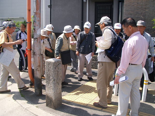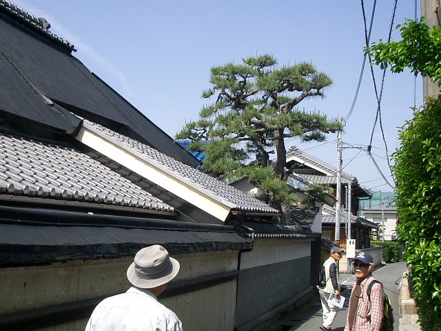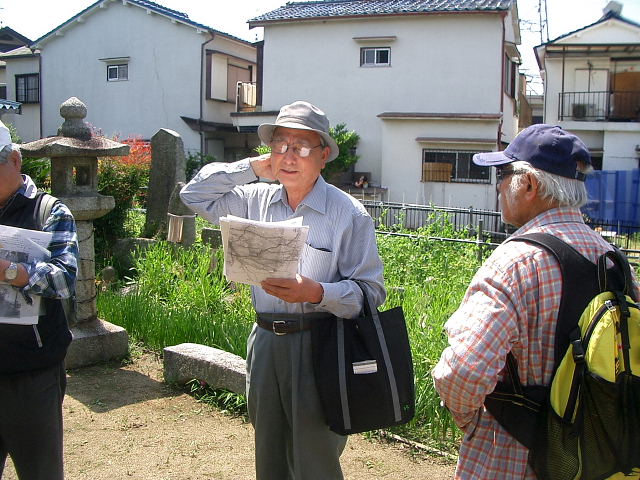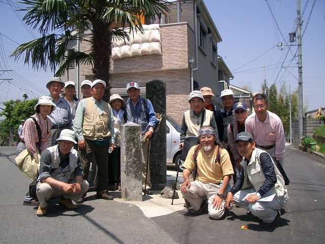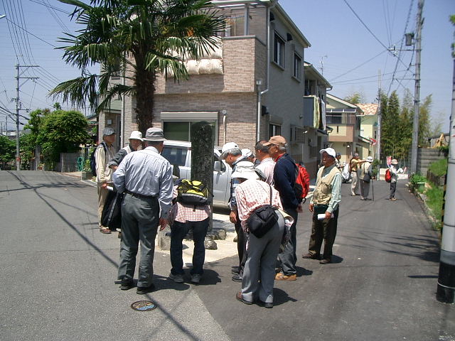 | 北田家住宅を通って今も所々に風情が感じられる静かな住宅街の山根街道を西に進み、砂子坂、逢合橋を渡り、東高野街道との交点に当たる上ん山の辻に到着。本尊掛松を見学後、12時過ぎ自由解散。 |