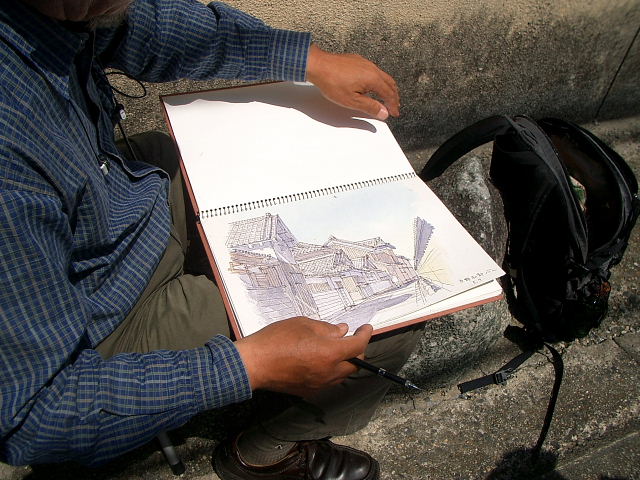 ![]() 丁度我々が通りかかったところ、車除けの石に座って山根街道沿いの風景を 写生されている方に出会った。声をかけると、気安くどうぞ見てください。 東京から来ていますとのことで、地元の画家・岸本さんのこともご存じの様でした。 |