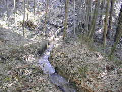 | 森新池を通り過ぎ、傍示への道を登ってゆくと、山側にU字溝で作られた小川が流れている。この小川を「新川」といい、200Mばかり登ったところに、交野水道局の貯水槽が2基あり、その手前を流れている小久保川から水の取り入れ口が造られている。 ここから延々1300mの水路が、森の山裾を縫うように堂池まで造られている。木立の中、薮が繁る中を先人達が苦労されて造られた貴重な水路である。 さらさらと流れる水の音を聞きながら、どんどんと小川沿いの小道を歩く。時々、立ち止まって回りの山合いを見渡し、心地良く水が流れる様に感激を覚える。幾度か曲がりくねった道を抜けると、突然目の前が開け、手前の森の村里の向こうに、交野市の町が一望される見事な風景が目の前に現れた。探検隊の皆、歓声を上げる。 堂池まで1300mを歩き、汗水流して造られた村人たちの苦労がしみじみと偲ばれた。堂池は沢山の水量で一杯だった。 堂池の北側の崖の海成粘土層を観察。森の惣墓に入ると、左手に迎え六地蔵、さらに一石三地蔵尊が祀られていた。その後、須弥寺で村里にあったといわれる沢山の石仏にお会いした。 円通山須弥寺の建っている場所が「堂ノ前」で、須弥寺の観音堂の建っている岡が「堂山」である。観音堂の山という意味で堂山と呼ばれている。 |