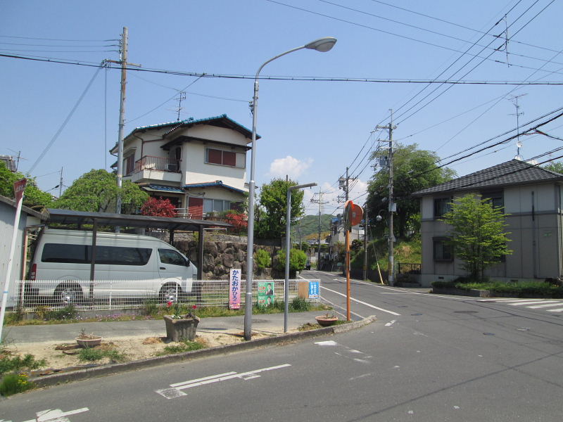 | 須弥寺から寺村方向へと進むと南川橋の交差点に出る。この交差点の北一帯は一段高い岡状となっており、水田にはなりえず、畑作と利用するのが精々であったため、大畑と地名が付いた。 大畑古墳は、交野で一番新しい前方後円墳で5世紀頃の築造とみられているが、今は住宅の下である。しかしながら、後円部を取り囲むようにして道が巡っており、前方部突端の「落ち」もハッキリ残っている。弥生時代の遺跡検出に伴って発見された。 弥生時代後期の遺物が出土した住宅地の上が最近の調査で、前方後円墳で、墳長90~95m、後円径50m高さ3m、前方部約50m高さ4mが確認された。 現在では、交野車塚古墳群に属していると分類されている。 |