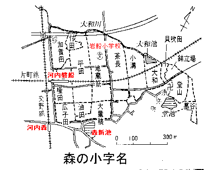 | 油田(あぶらでん) :森は石清水八幡宮の神人(じにん)として昔から仕えてきているので、油田は八幡宮の燈明の油代として、この田の米を上げていたという説をとってある。 しかし、村の長老たちの中には、それもあったであろうが、天田宮の油代としてこの田の米を換金していたという両方の説がある。今はどちらが正しいのか判断する根拠がないのであるが、どちらも間違いではないだろうし、時代の違いから後世になるにしたがい、八幡宮よりも地元の氏神を大切にするようになり、天田宮の賄い用の田となったと考えるのが妥当のように思える。 大量権(だいりょうごん) :。「権田」と同様、開墾地のことである。しかも大規模に開かれたものであろう。小久保川の水を利用したり、森新池の水を利用したりして、扇状地の扇央部の砂質の所の開墾が行われたものと思われる。 城戸(きど)・北城戸(きたきど) :森の村の中から北東へ抜ける道があり、寺へと通じる道に出たところを北城戸という。 城戸は、京阪河内森駅より東へ、森に通じる道路がカギ型に曲がる合流地点を言う。 城戸とは、木戸のことで、森を通過する山根街道の東西の入り口に木戸を設けて、村を出入りする人々をチェックしたり、村への乱入者などを取り締まったり、夜間は戸を閉めたりして、村を防備した所である。 |