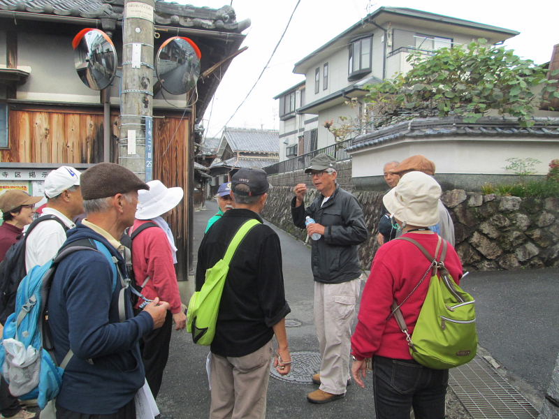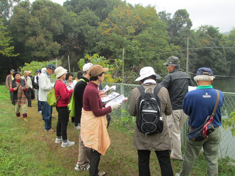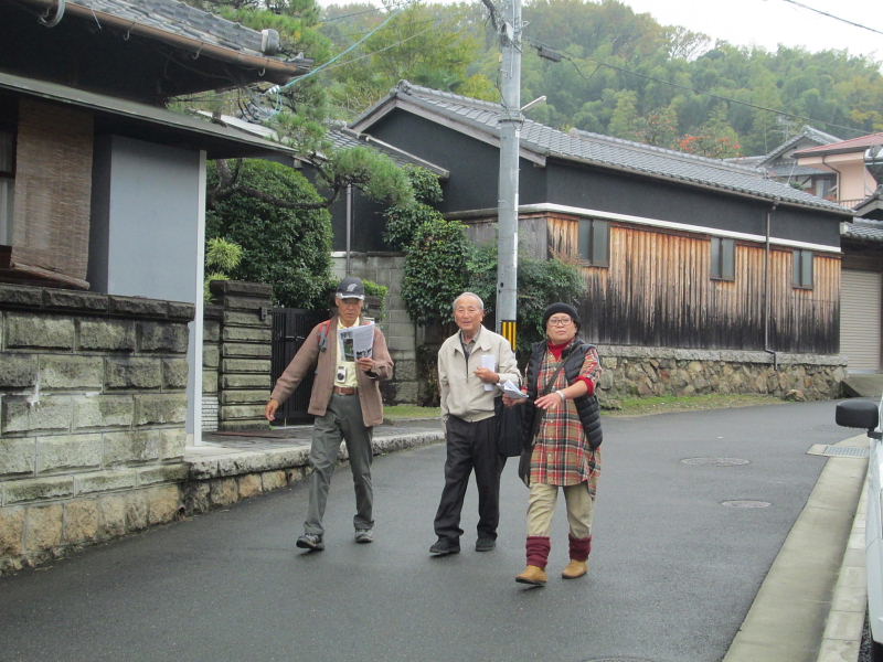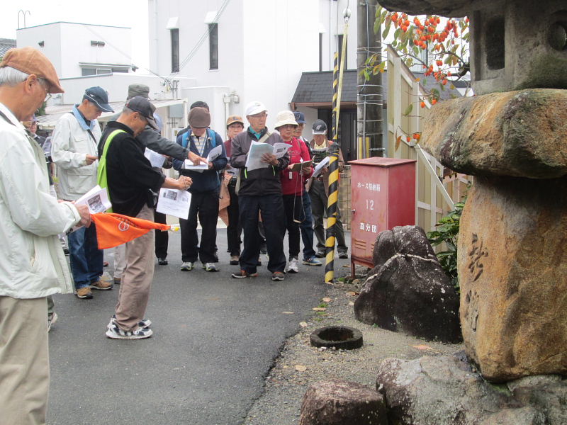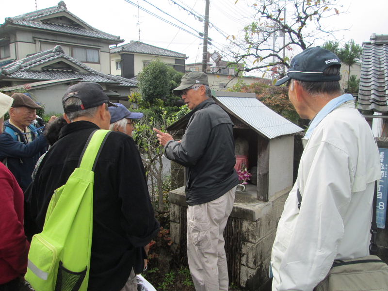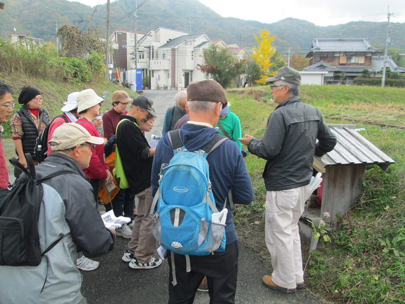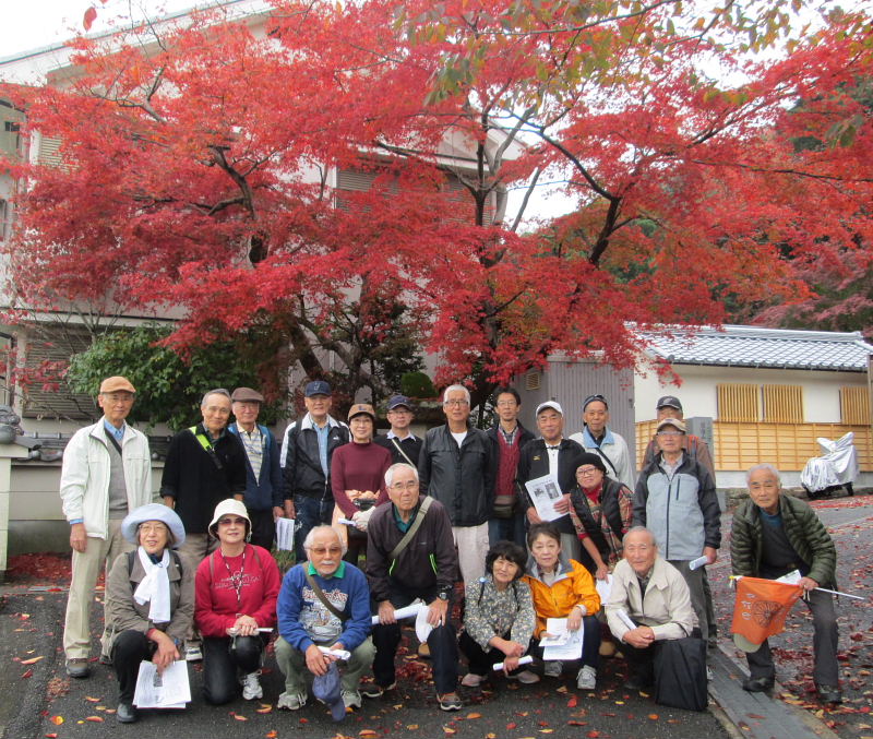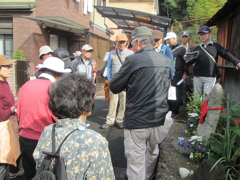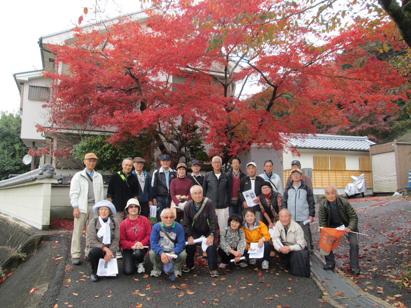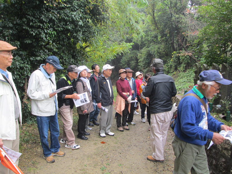 | 交野歴史健康ウオークは11月15日(火)午前10時、京阪河内森駅前に集合。前日、夕方遅くから雨が降り出し明け方にはやっと雨が上がり、当日はお陰様でまずまずの秋晴れに恵まれ、22名(会員18名)が参加され和気あいあい大変楽しいウォークとなりました。 先ず、高尾部長より挨拶があり、続いて、講師の平田政信さんよりウォークの行程など案内の後、山の根の道や石仏について詳しく解説いただきました。 森村の磐船村役場跡・地名を皮切りに、蛙石の伝説、須弥寺では五穀豊穣と子孫繁栄を願う陽石のことや三十三観音、唐うす地蔵のこと、森惣墓入口の一石三尊にまつわる石仏との対話、堂池に注ぐ新川の歴史のお話などなど何度お聞きしても飽きることのない軽妙な語り口にすっかり酔いしれました。 先月に引き続き案内役をお引き受け下さった、平田さんの楽しく分かりやすい、交野に心底惚れ込んだ平田さんのお話ぶりに、参加された皆さん一様に話に引き込まれ、笑ったり頷いたり本当に楽しい歴史ウォークとなりました。 初めて参加された方からは、「いろんな歴史も良く分かり、尚且つ健康を願ってのウォークにすっかり嵌ってしまいました。」との感想でした。 |