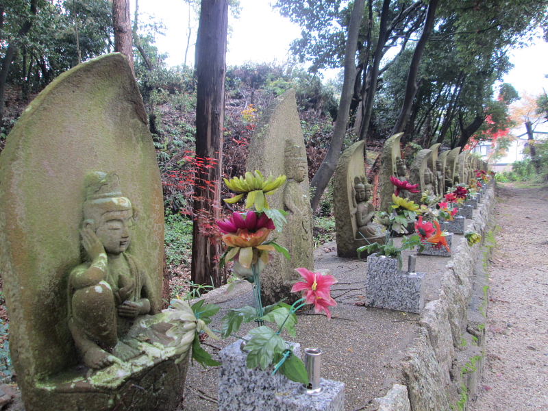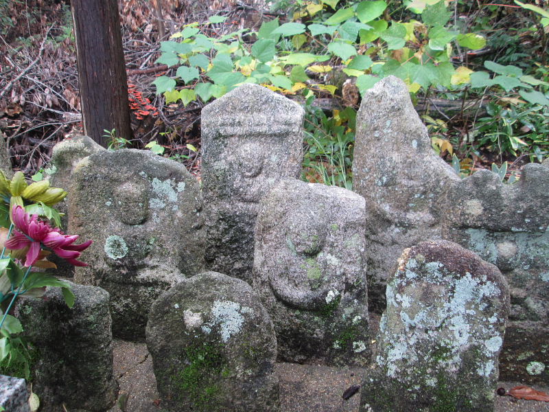 | 森の惣墓に入ると、左手に迎え六地蔵、さらに一石三地蔵尊が祀られている。 | ||||||||||||||||||||||||||