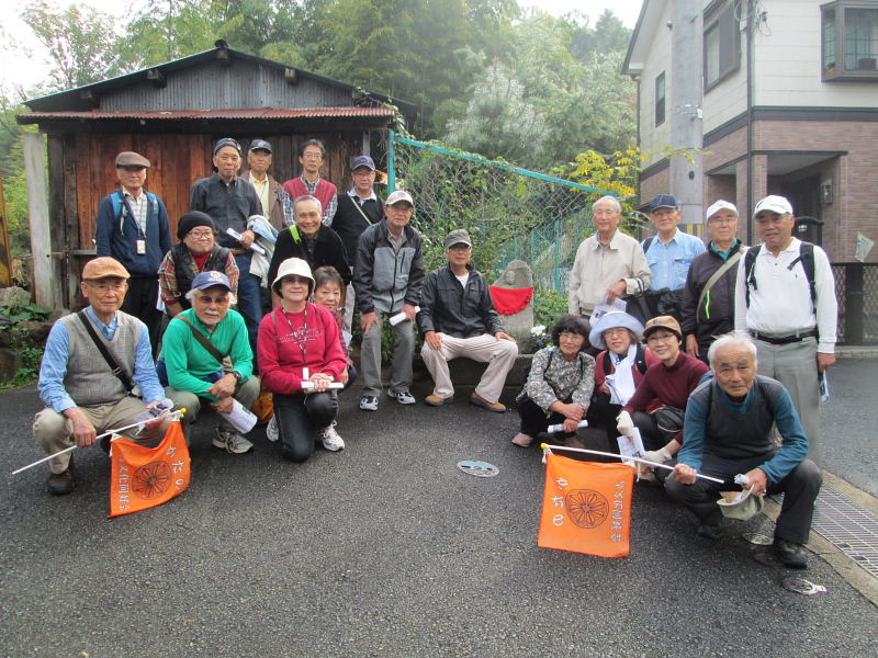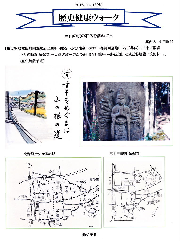 交野歴史健康ウォーク 第161回 =山の根の石仏を訪ねて= 2016.11.15(火) 京阪河内森駅 午前10時集合 行程 : 京阪河内森駅⇒森・磐船村役場跡⇒森の地名⇒城戸⇒灯篭の辻・蛙石⇒ 須弥寺⇒三十三観音⇒堂池⇒大畑古墳⇒寺たつみ山(石灯籠)⇒ かさんど池⇒とんど場地蔵⇒かたのドーム 12時過ぎ解散 案内:平田政信氏(交野古文化同好会) 参加者 22名(会員18名) |